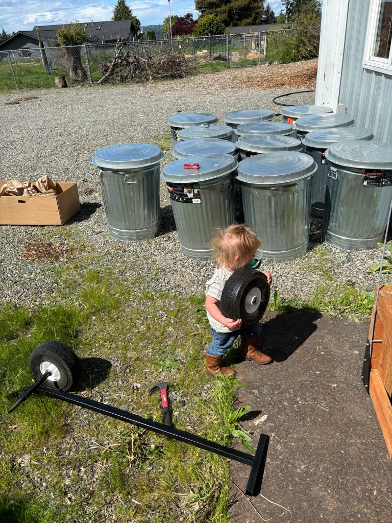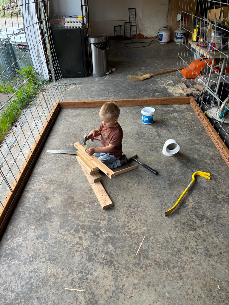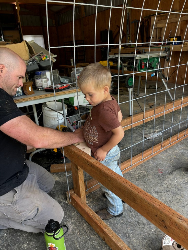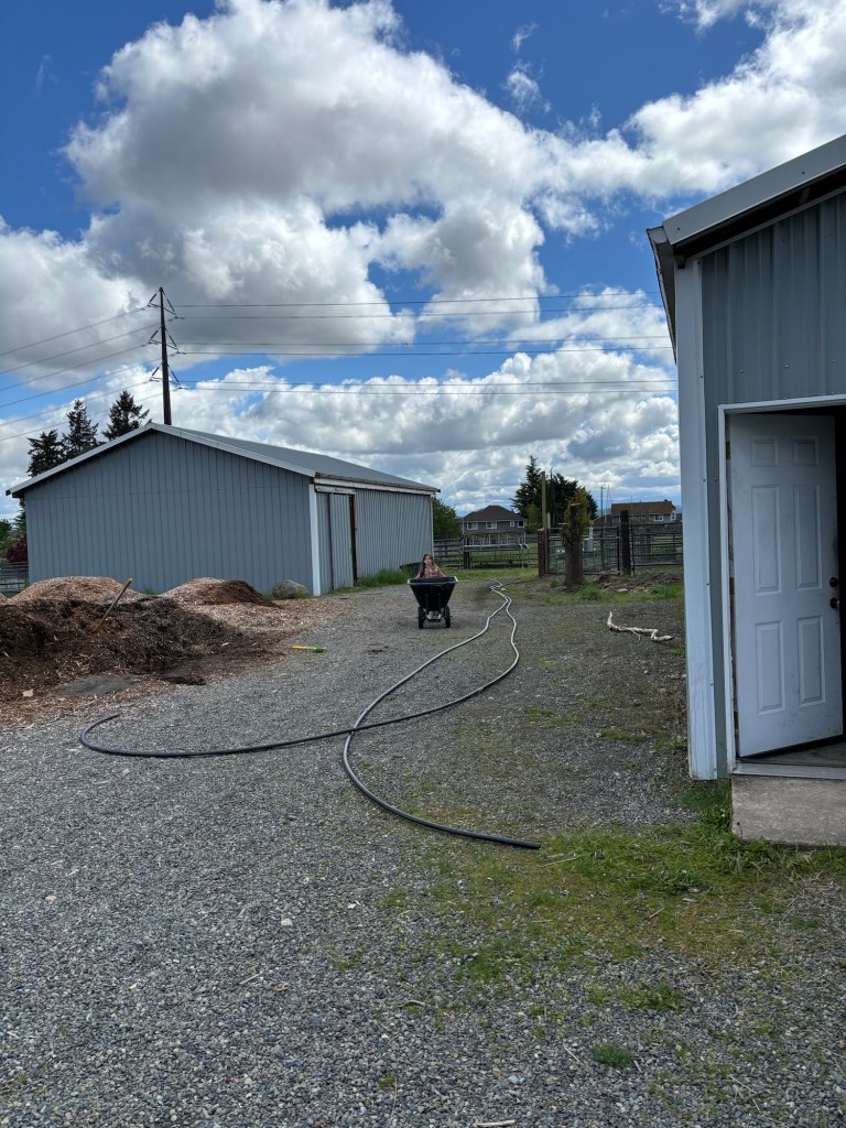 Ellie was sent to go get a roll of wire from the barn. Apparently she needed Seppi and a wheelbarrow to bring it back to the shop.