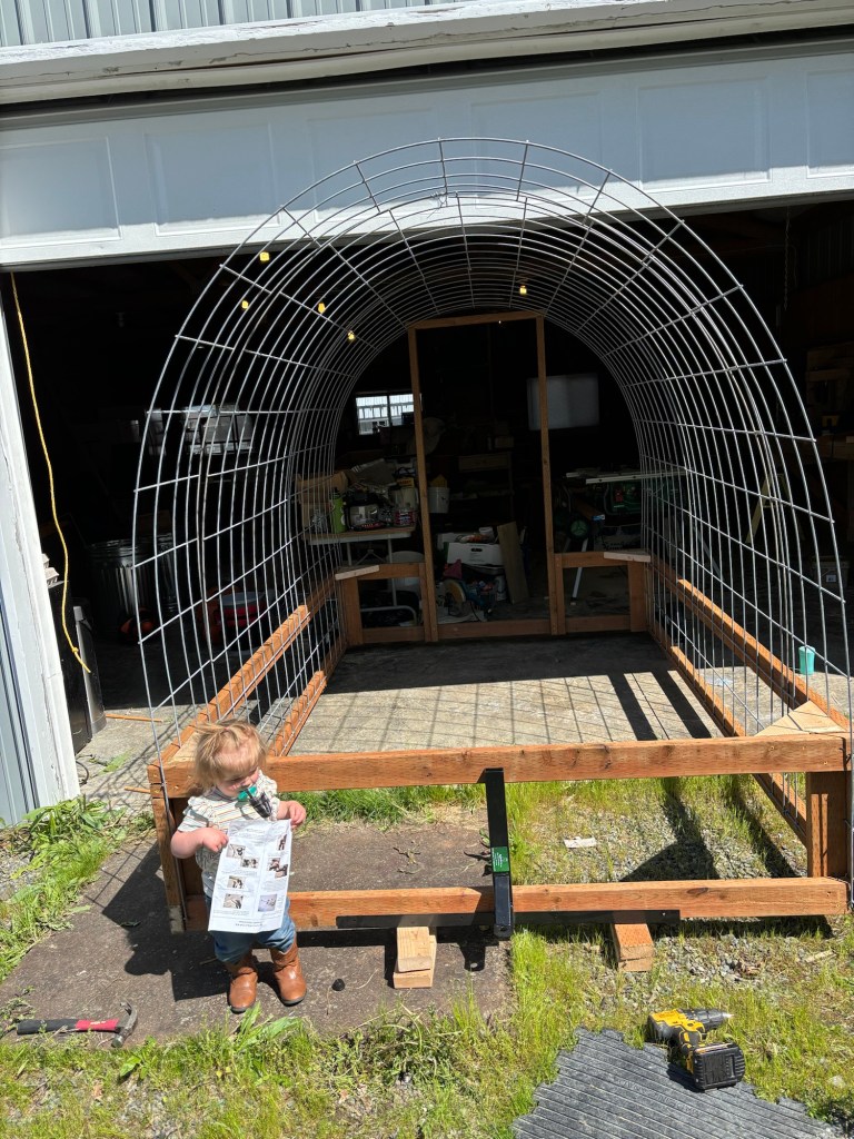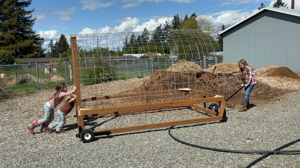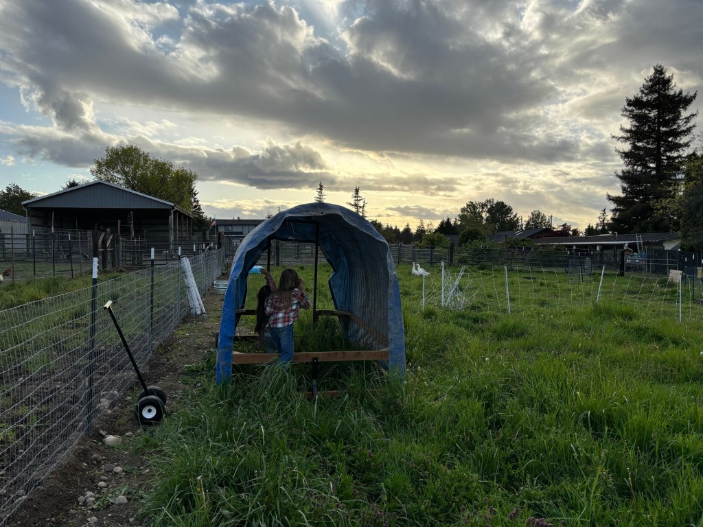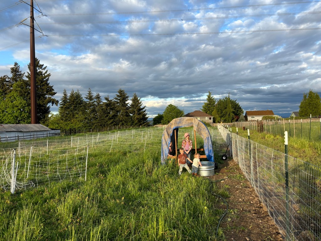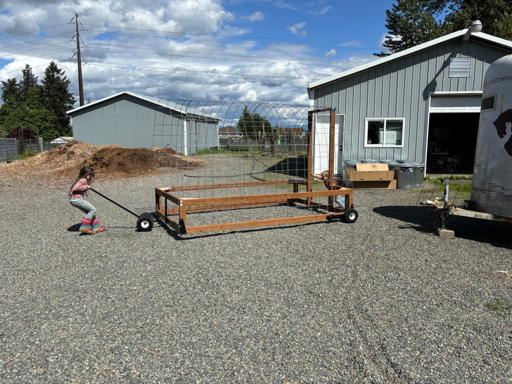 We took the tarp off the hobo shelter we had made for the pigs and wire tied it to the mobile shelter frame.