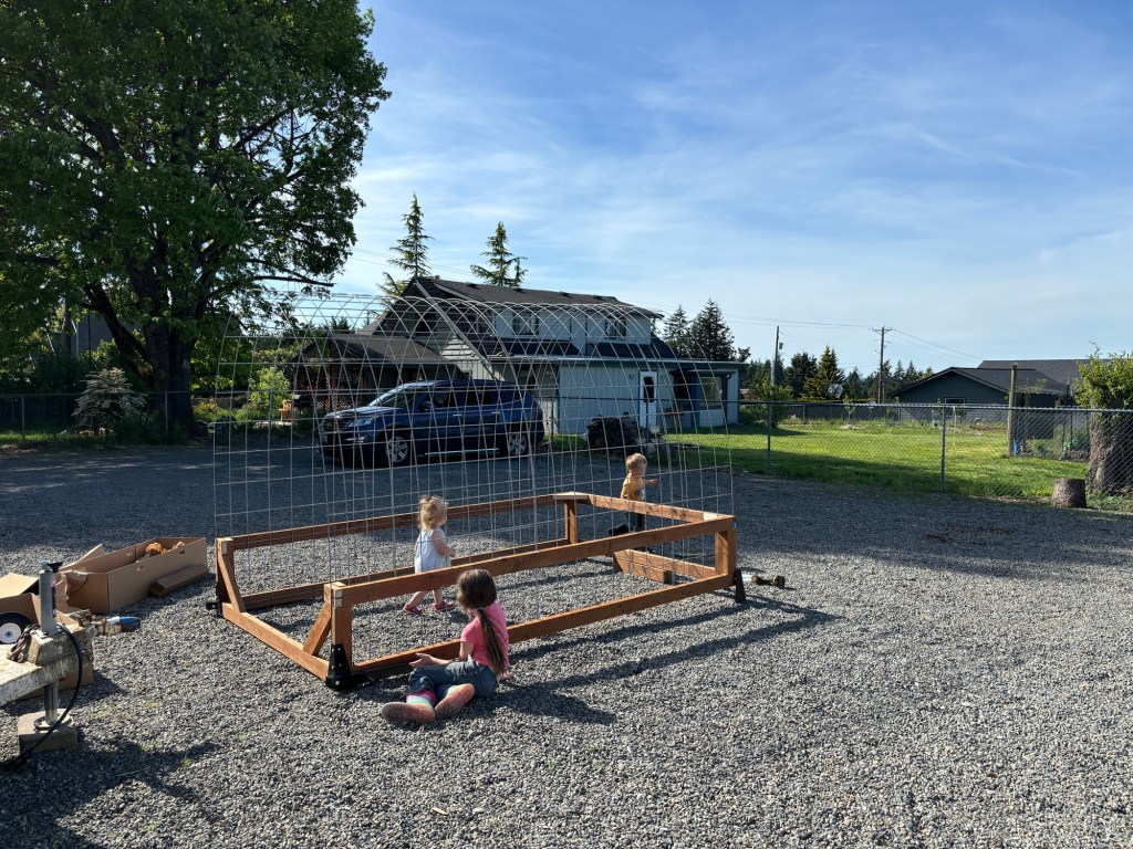 Of course we had to take breaks for school, lunches, naps, etc. So it was late afternoon by the time we got to this stage. We added the vertical corner braces, using a garbage pail to hold the frame off the ground to screw the underside of it.