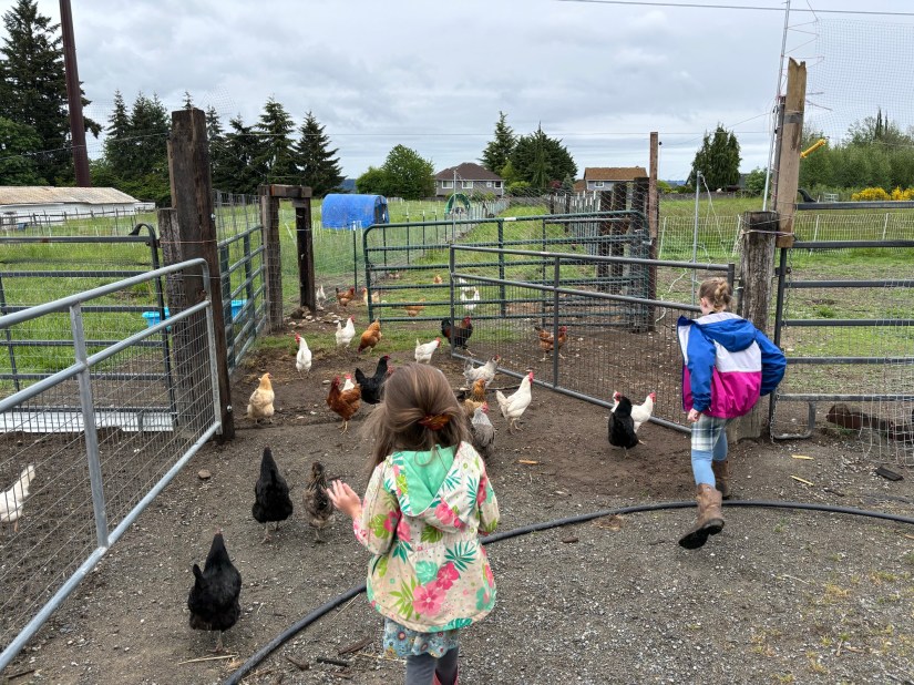 Her “Buck-bucks” wanted to go scratch through the pigs’ straw pile, so she helped them out.