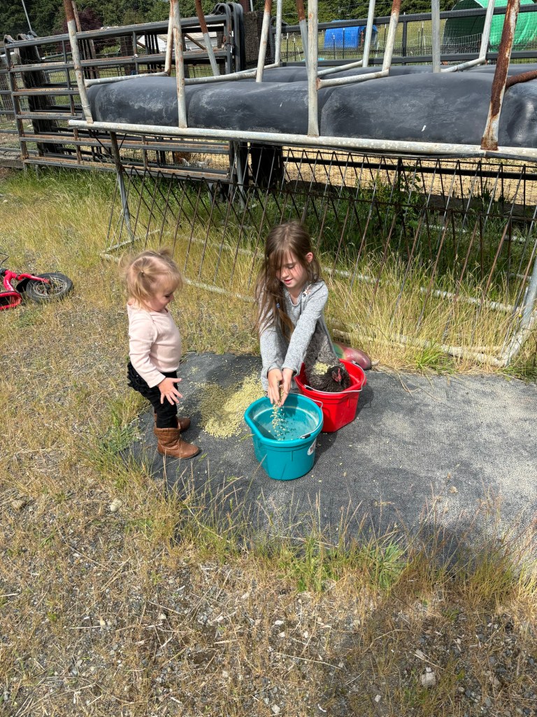 Yes. There is a chicken getting showered with layer feed. No. I don’t know why. We did have a talk about the cost of feed and appropriate ways of feeding it to chickens, but some things will forever remain a mystery.