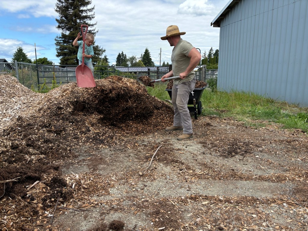 Then Daddy loads up a wheelbarrow full of wood chips and dumps it around the bush so that it covers the paper.