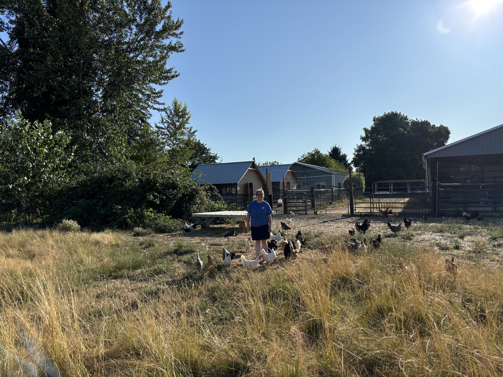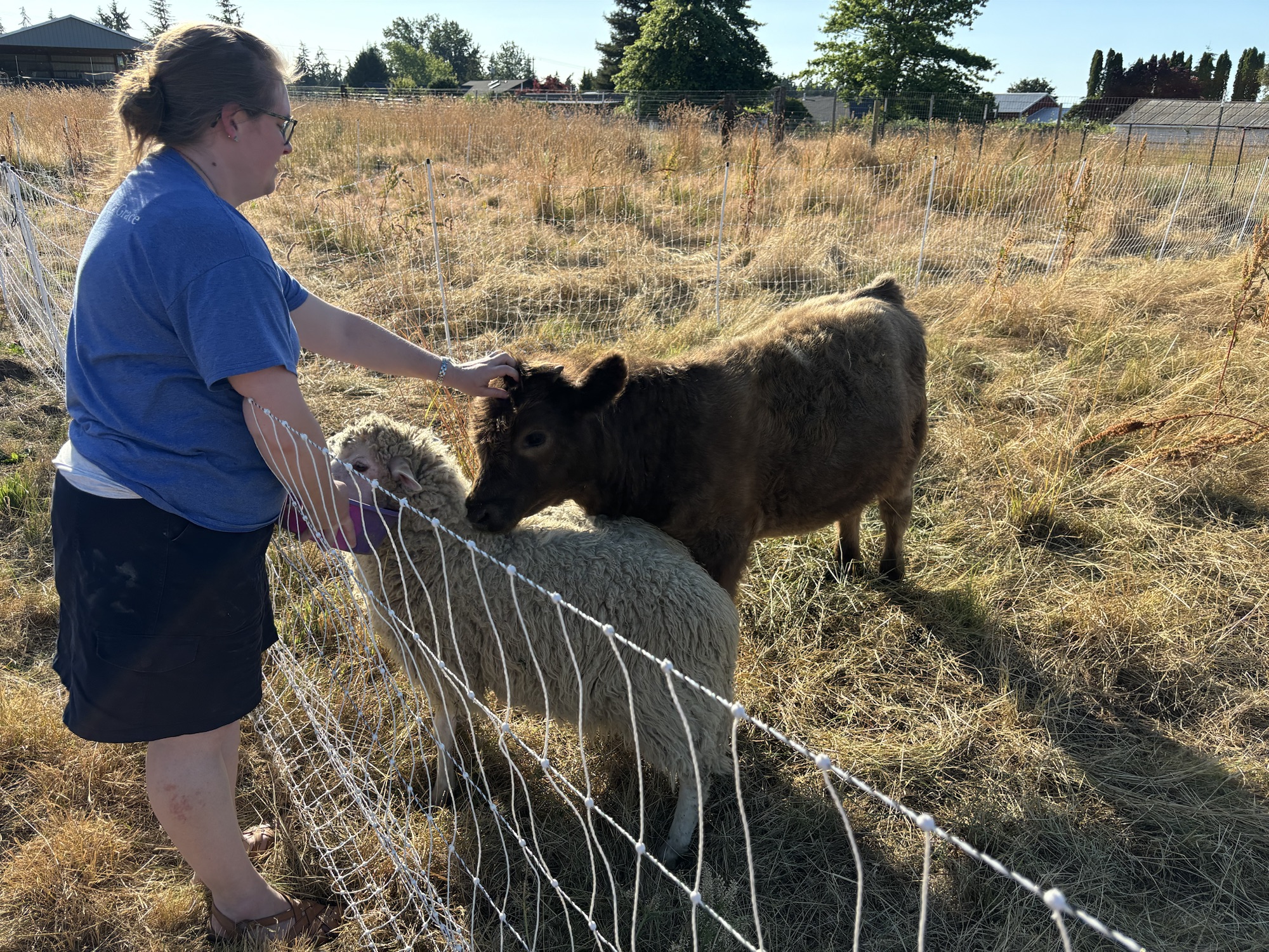Pasture is starting to get dry and short, so we tossed in a bale of hay. The steers thought it was tasty, the sheep didn’t seem terribly interested.