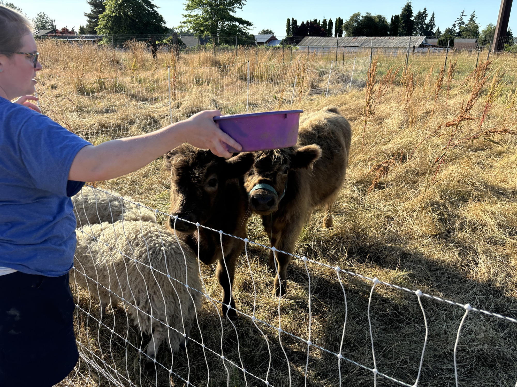 The sheep will happily bound over and eat all the alfalfa pellets. The steers are a little bit more circumspect.