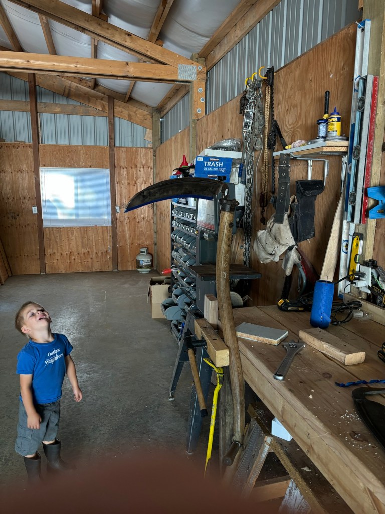 While they trimmed the brush, Seppi and Daddy put our new bush blade from Baronyx knife company on our scythe snath that we got from Papa’s shop.