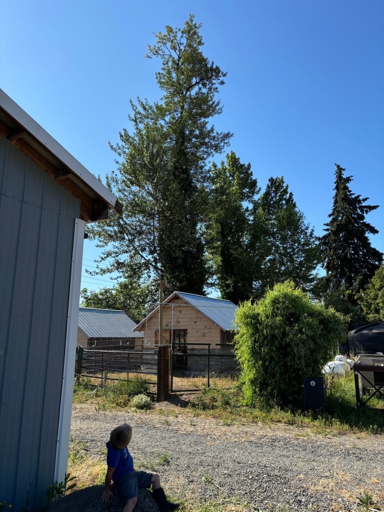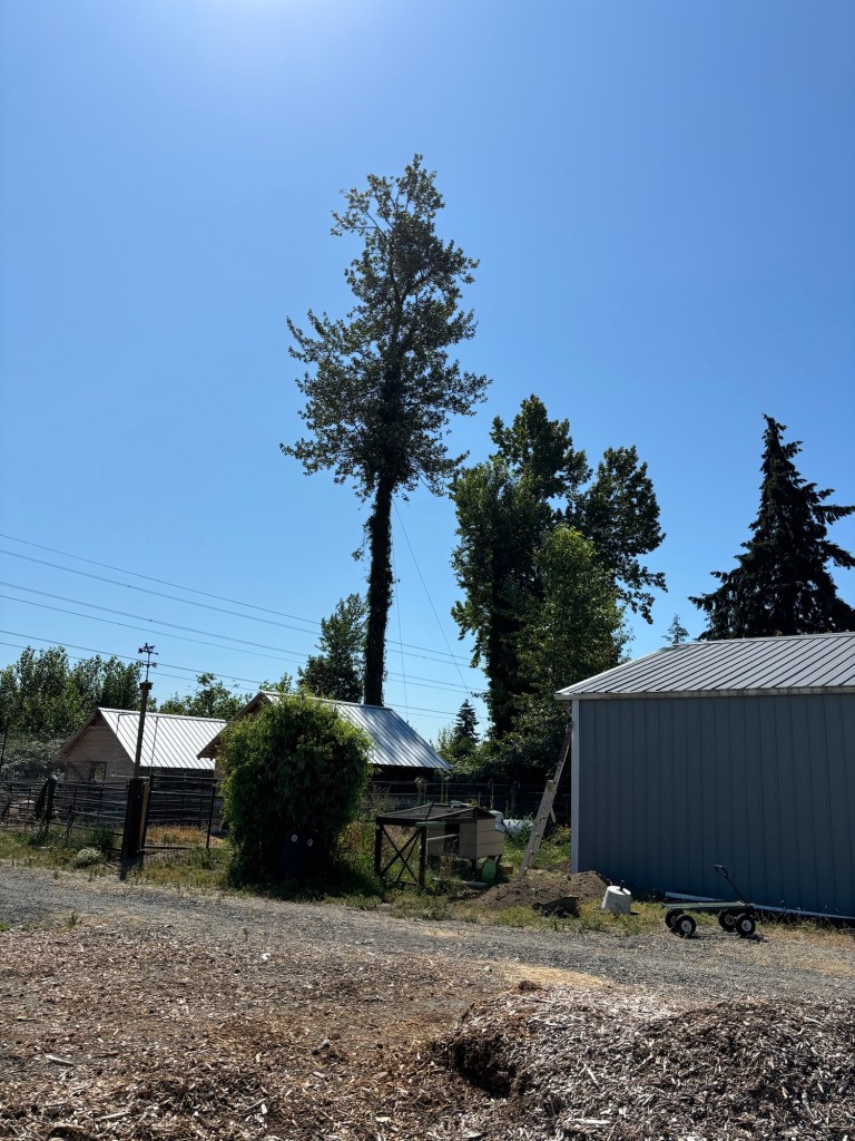 Our elderly neighbor had a couple of big old cottonwoods, overgrown with ivy, that have been ominously leaning over our barn, shop, and hogcken coopen for the last two years since we have owned the farm. We finally got around to chatting with him about it, and worked out a deal to get a local tree company to come in and take them down.