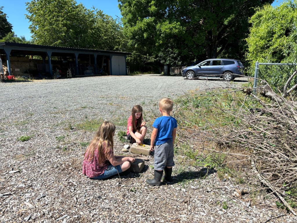 Almost lunch time, and they had successfully gotten the entire tree cleared enough to get a rope around the upper half, and access the base. The kids enjoyed the show while playing “Indian” (are kids allowed to play that anymore? They were pretending they were foraging for food and making it into “soups” and “breads.”