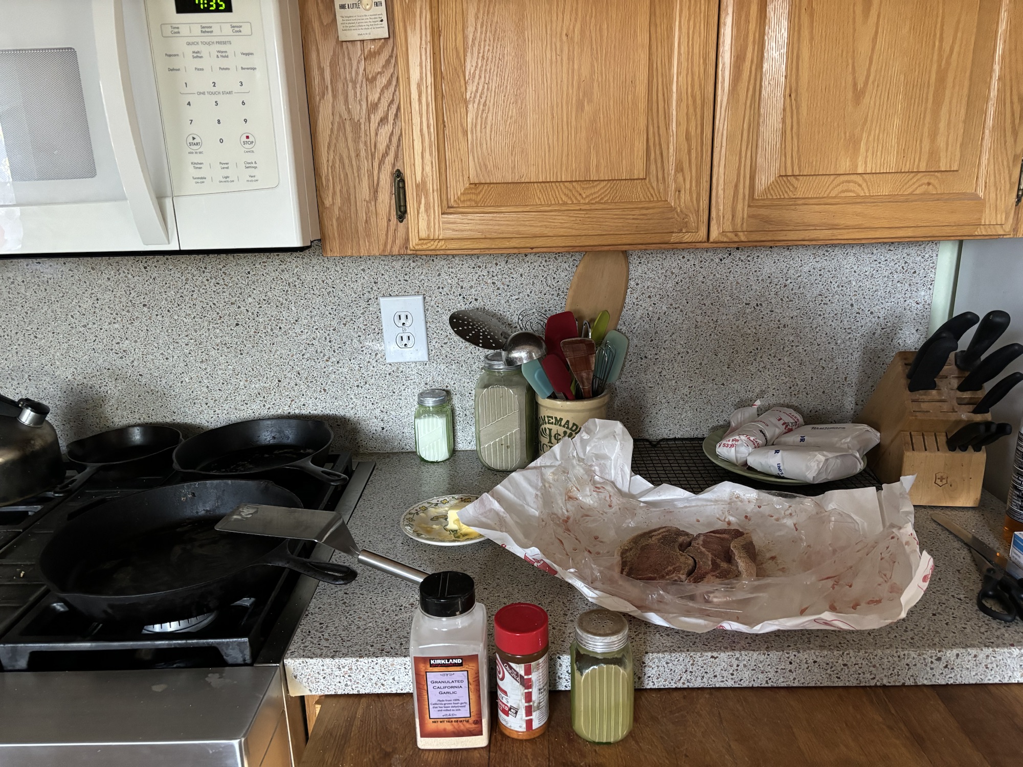 Less than 15 minutes to prepare two pork chops from start to finish, since they are an inch thick, they are pretty hefty.