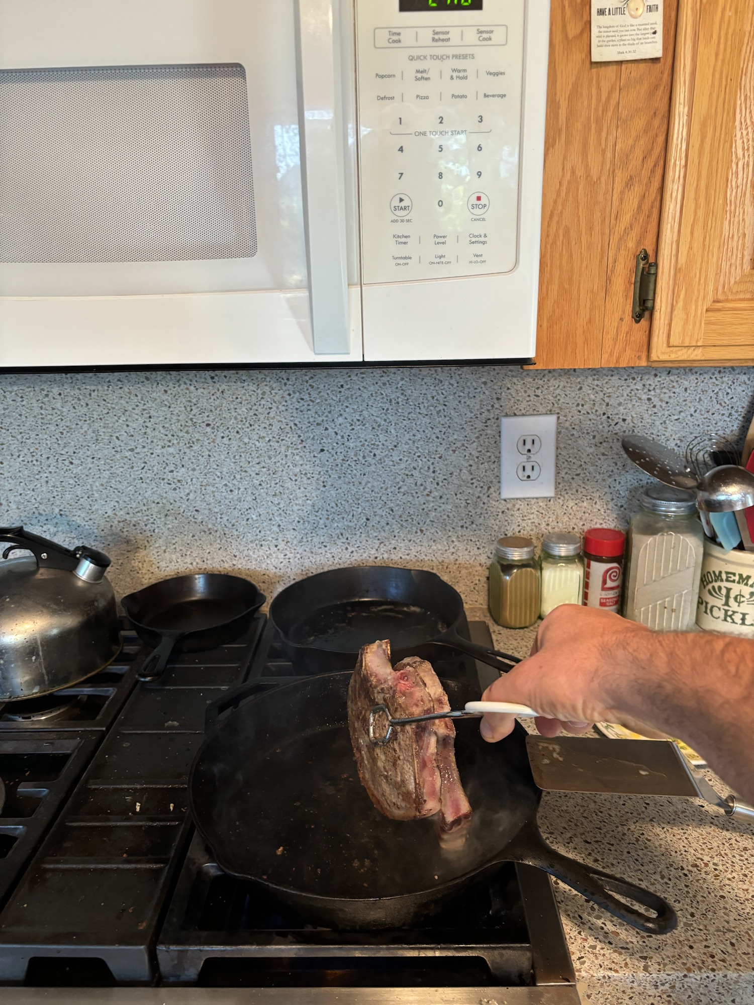 Preheat oven to 425, heat, the cast-iron on the stove, top, rub the pork chops with Seasoning salt, pepper, garlic powder.