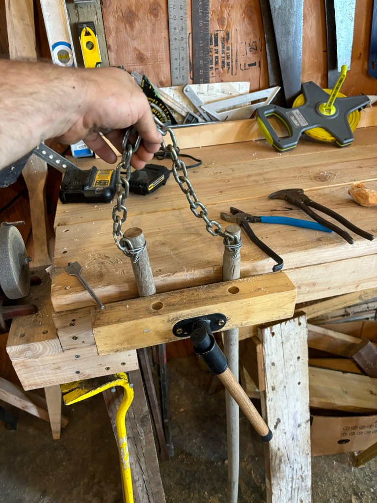We decided to try another method. Daddy quickly cobbled a flail together from an old tool handle and spare length of chain.