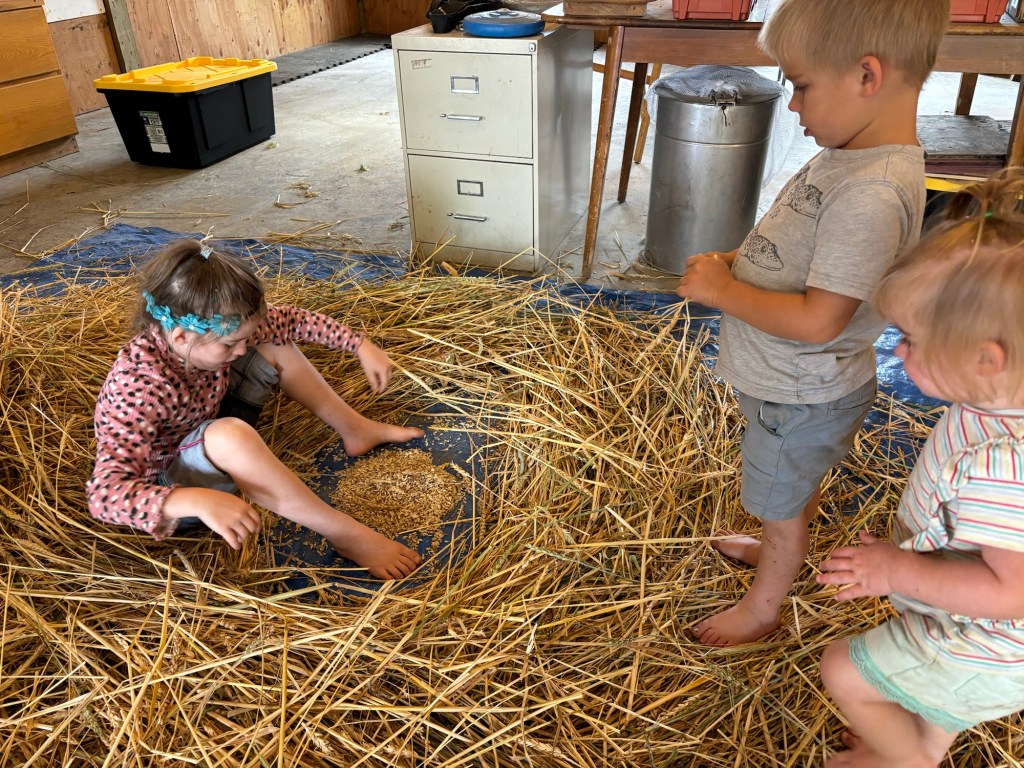 Last week we harvested the wheat, so that it wouldn’t get rained on. Timing the harvest is a bit of a challenge. If you harvest it too early the sead heads are green and they don’t let go of the seeds worth a darn. If you harvest it too late the seed heads dry out and open in the row and dump the seeds on the ground. Complicated by the forecast of an unusual 2-3 days of damp, drizzly weather in late July, and a summer camp weekend, well… we did our best.