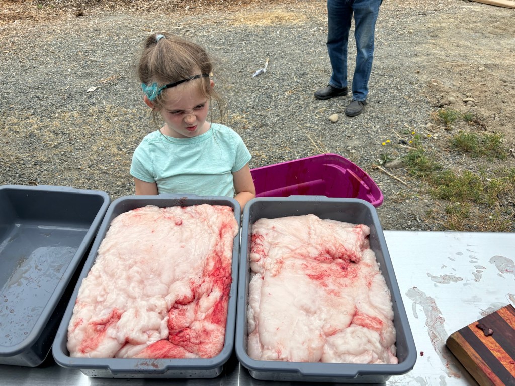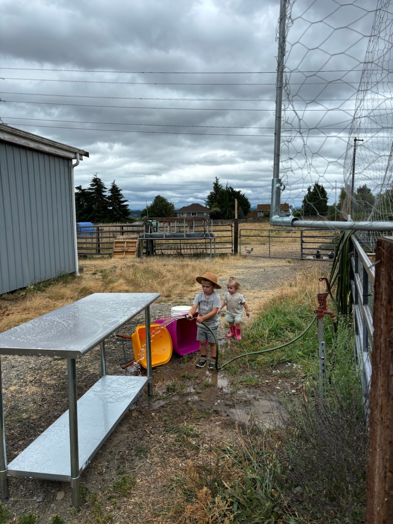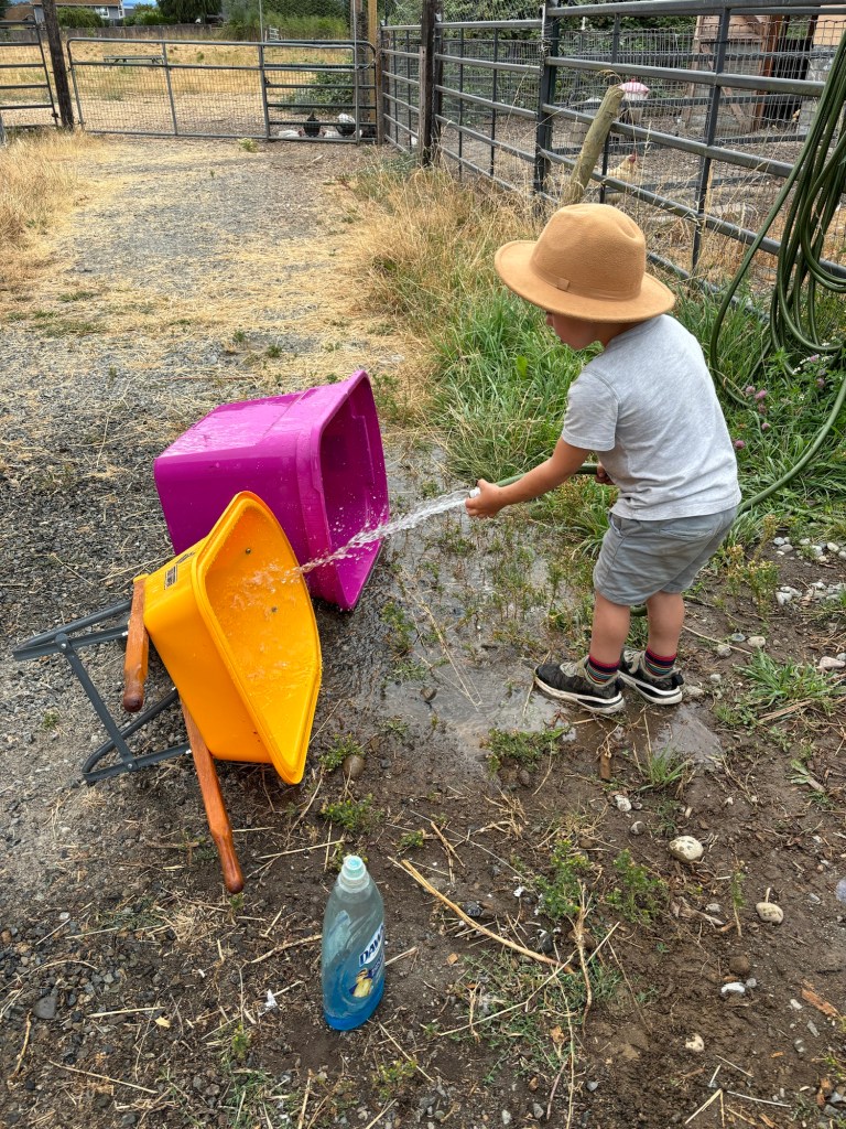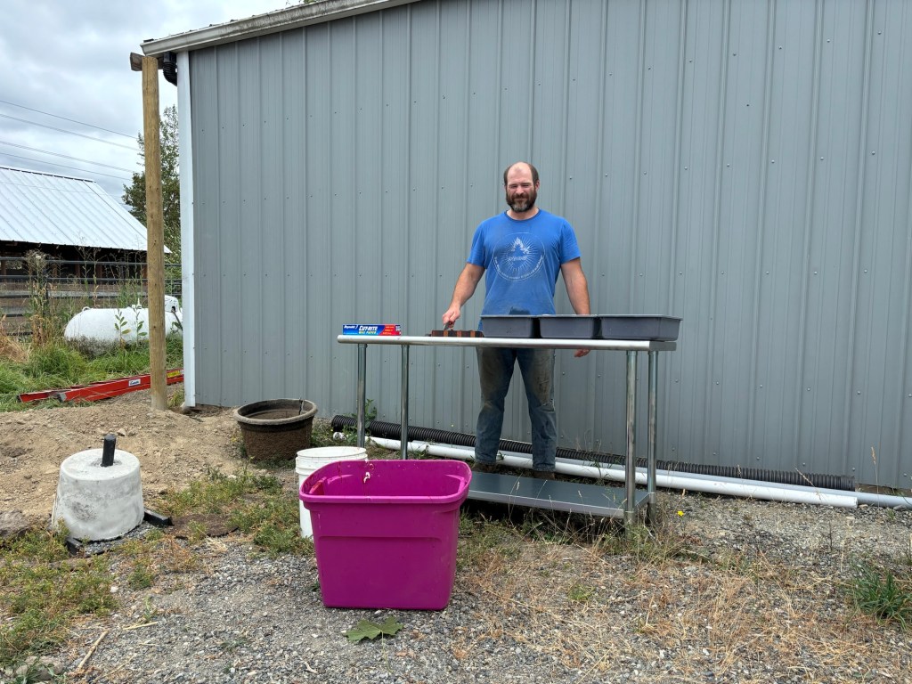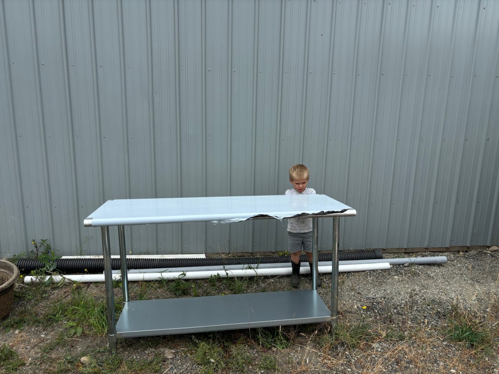 We still don’t have hot water outside anywhere. Running potable water direct to the shop and putting in a hot water heater is a big job we don’t have bandwidth for right now, and people survived for thousands of years without such infrastructure. We simply boiled water in the house, put it and some dish soap in the pink tub, and scrubbed it out with towels. Seppi rinsed it with the garden hose.