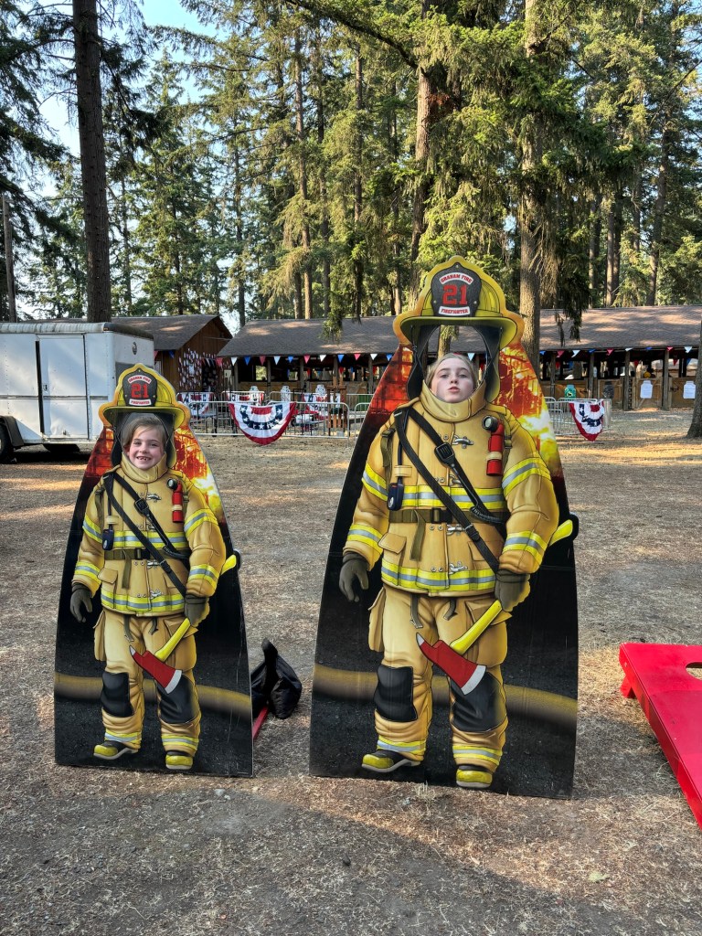 This picture was taken half a second before Evie knocked her fire-fighter sillhouette over flat because it was just a bit too tall for her. The other one was too tall for Ellie, but she had a stool to stand on
