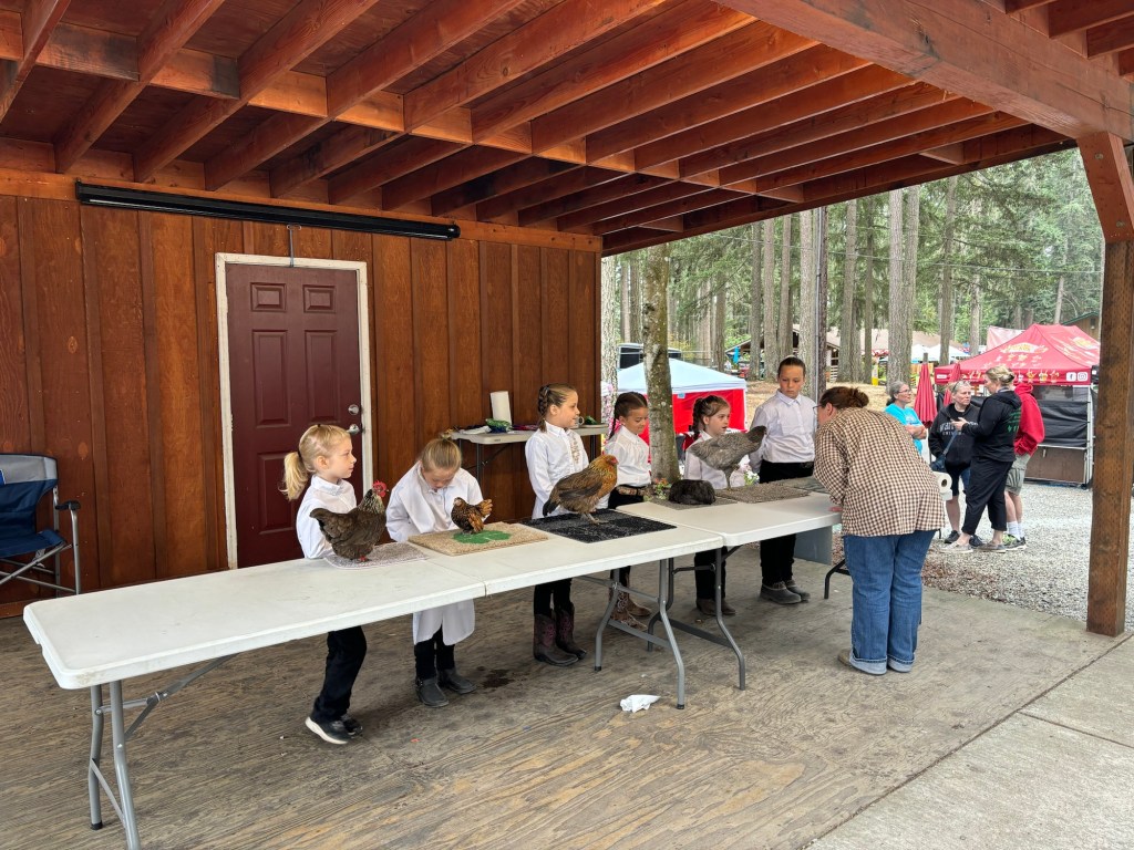 Let the judging commence. The children have to demonstrate control of their bird, meaning it has to be able to stand still on the carpet square without being held; they have to answer poultry-related questions (which includes questions about ducks, geese, turkeys, pigeons, etc); and they have to stand still and look the judge in the eye (the most challenging part for some).