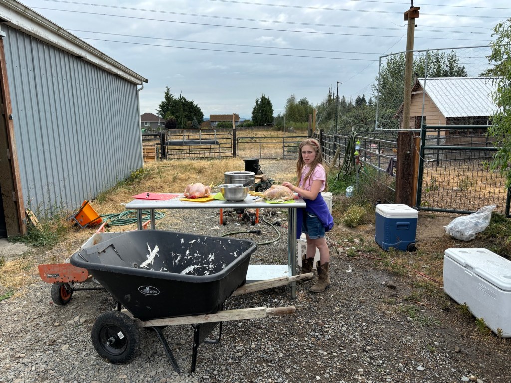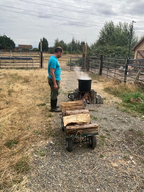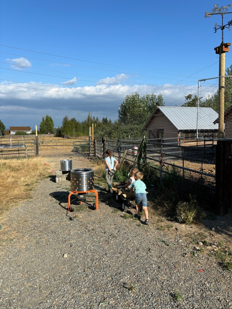 The kids helped by bringing firewood for the scald station. We ordered a propane scalding pot, but it still hadn’t arrived so we went old school, putting Mommy’s 50 gallon stock pot on a wood fire. Which worked well, though the pot is now irreparably black.