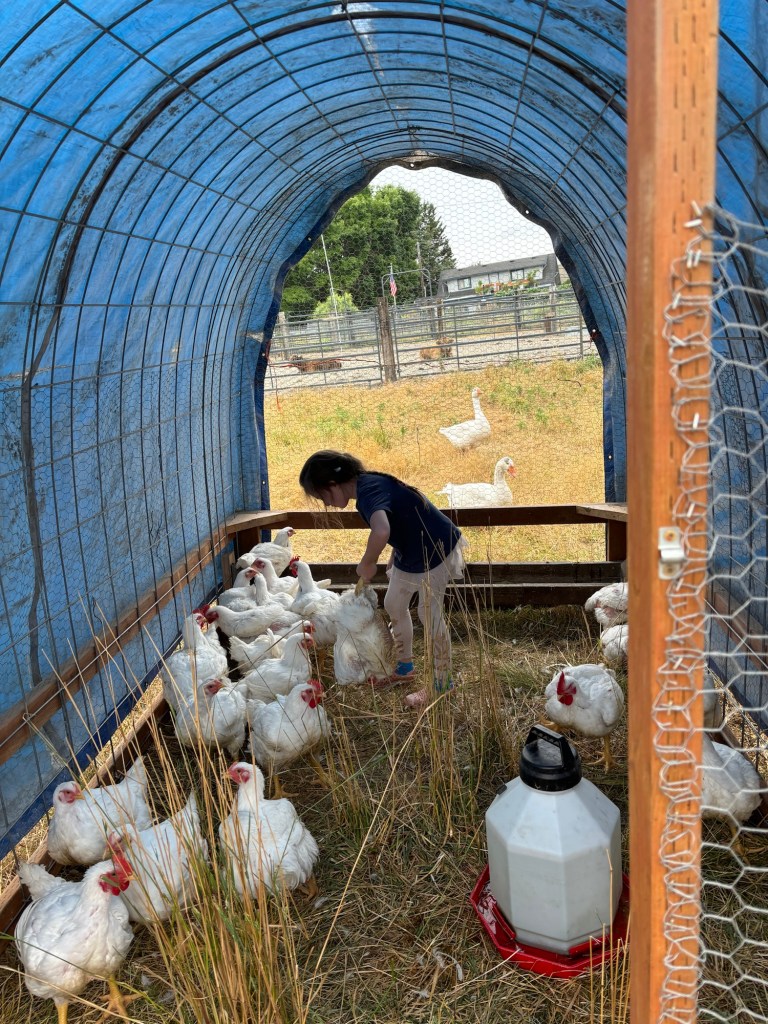 Here you can see the two remaining geese, the breeding pair, meandering around the pasture watching looking for opportunities to steel feed from the chickens.
