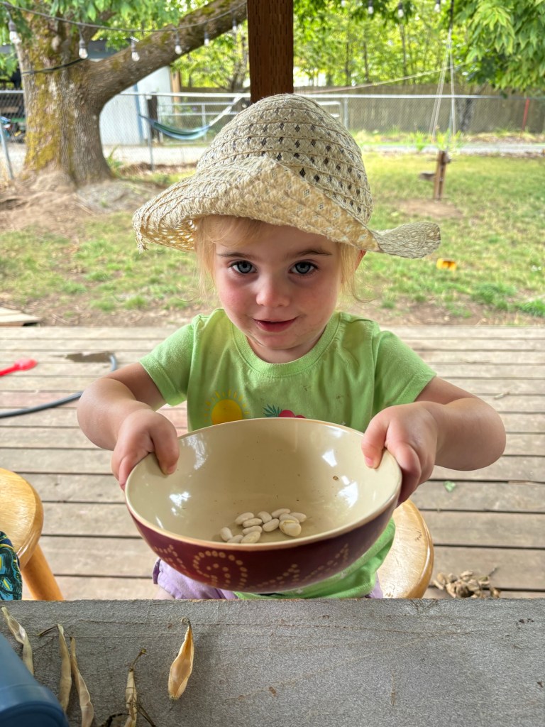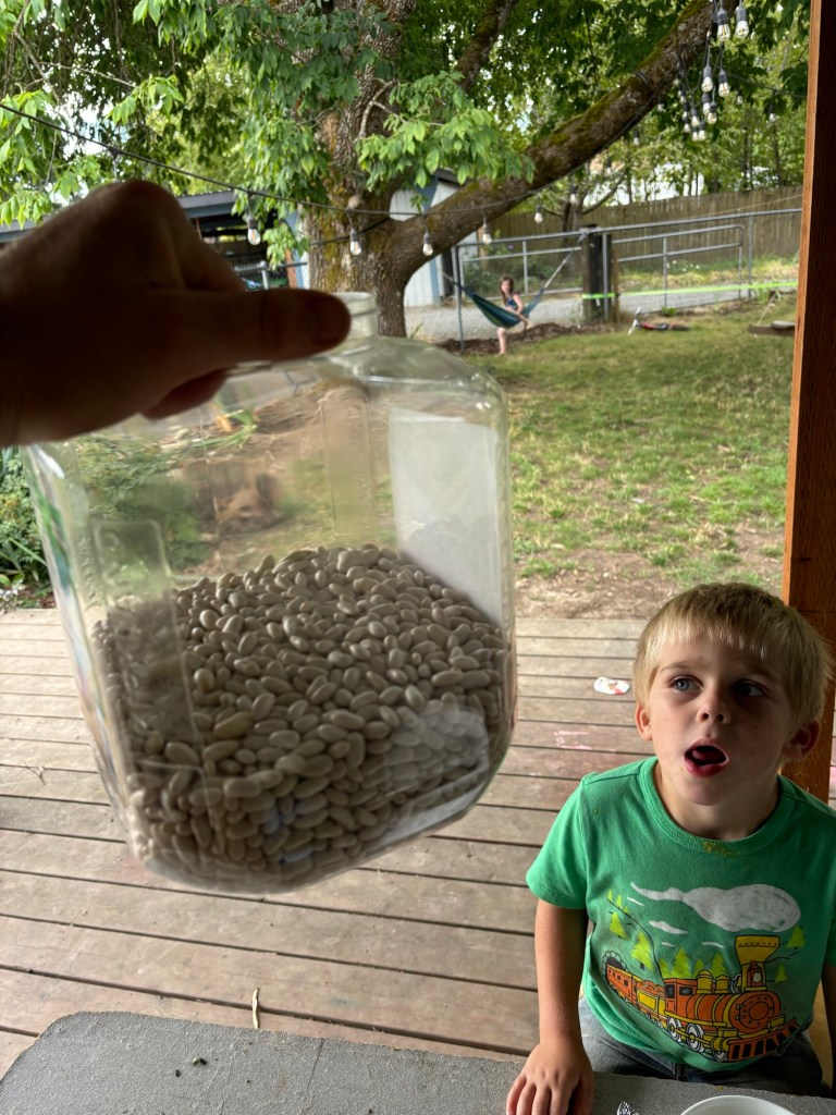 That’s a lot of beans. Considering we planted only a few ounces of bean seeds, and got about 10 LBs. Actually, we should weigh them to see how much we got. We aren’t great at quantifying our harvests. Now, we will store them dry until we get time to pressure can them. Once pressure canned they will be ready simply to dump into a stew whenever we need to make one, which is great for quick stews in the afternoon.