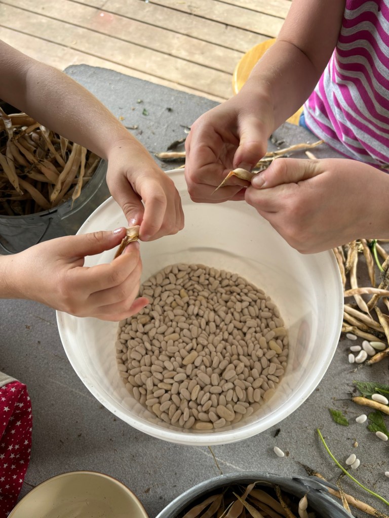With the week of heavy rain and colder temps, our cannellini beans became damp, the ends of many of the pods started molding, and a good handful of bean seeds began sprouting in the pods, so Monday morning, the first non-rainy day we could manage it, we picked all the cannellinis.