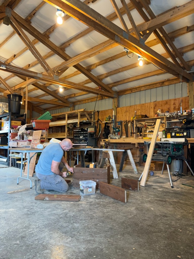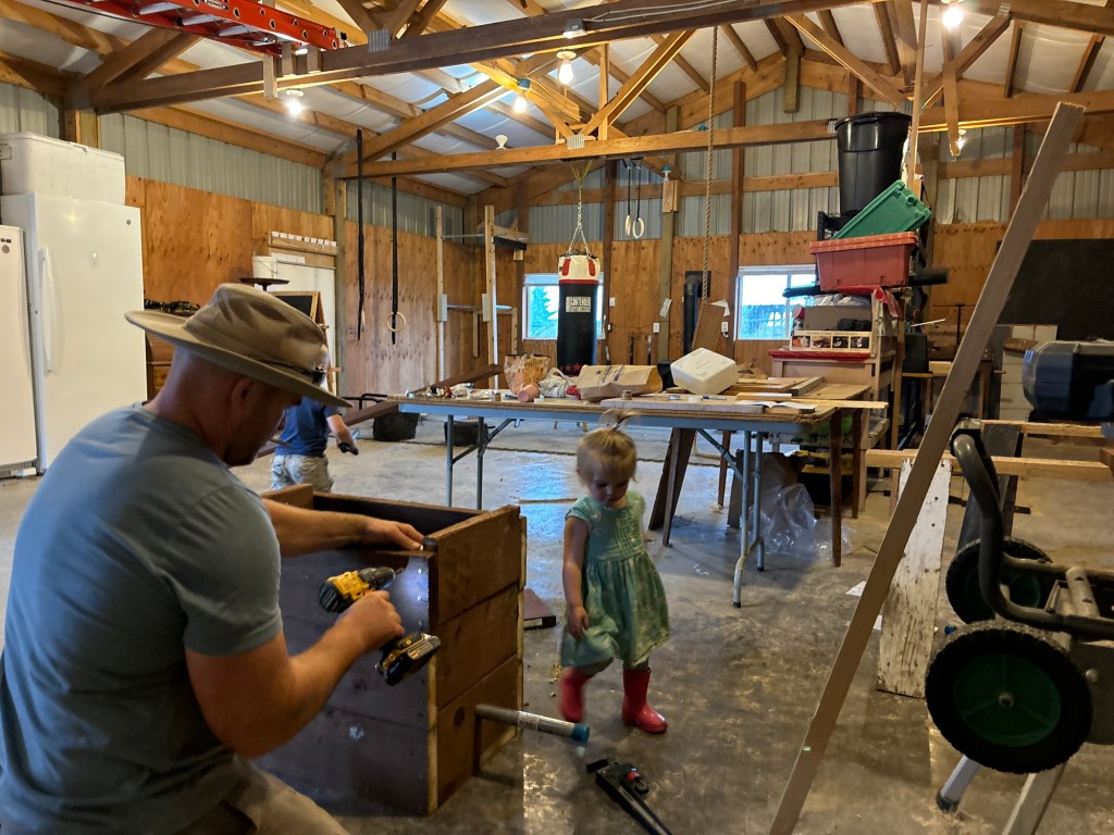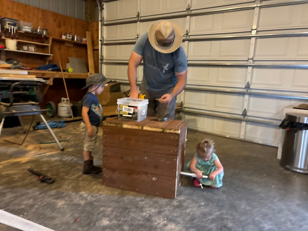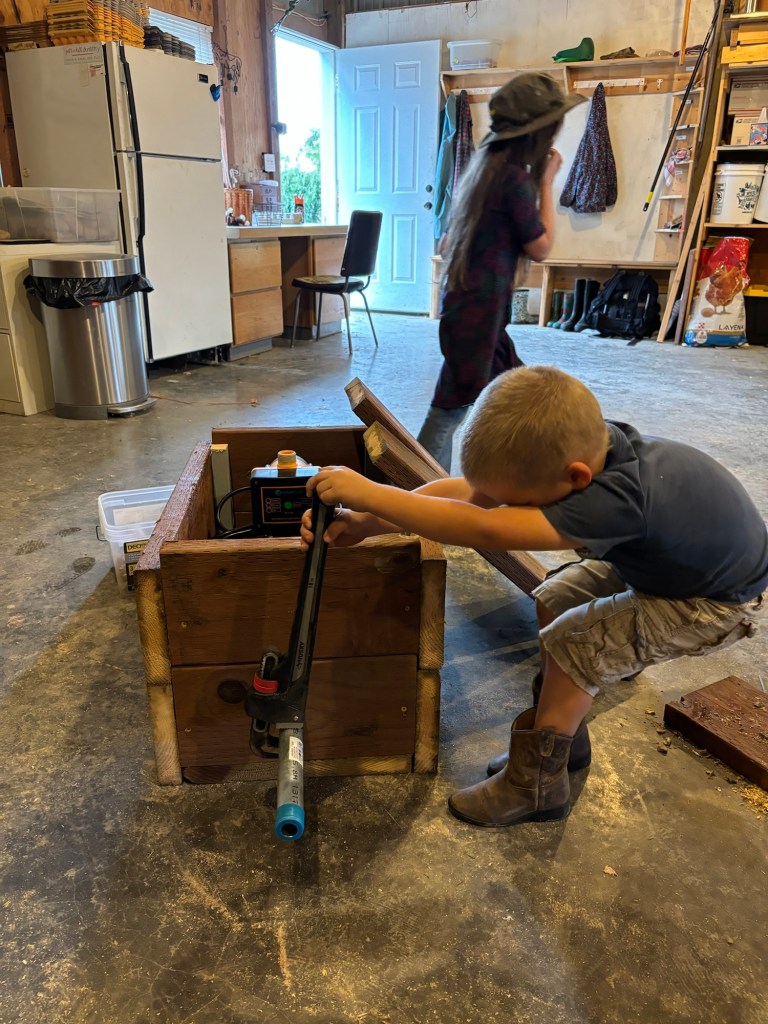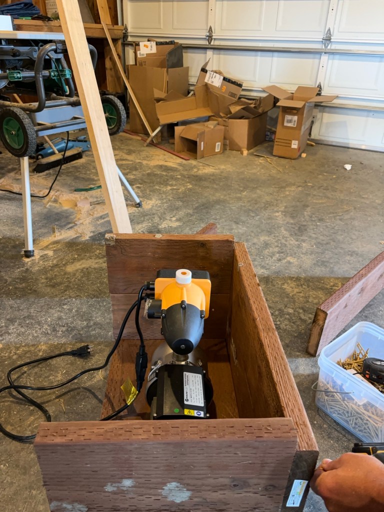 The pump for our rainwater catchment system is an inline RainFlo MHP75A Automatic Booster pump. The idea is that it will pump water from the catchment tank to the water lines that feed the pasture. Obviously, this means that the pump needs to be mounted on a sturdy surface, and additionally, the place that it is going is underground, against the back wall of the shop. This means we have to house it in a fairly sturdy box which will withstand water for many years without rotting, and will prevent dirt from under the shop pad from settling down against it and crushing the sides.