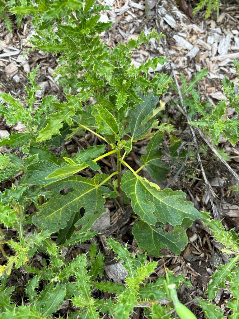 A beautiful little fig, just a-sproutin’ up! Who knows, it may bear figs one of these years.