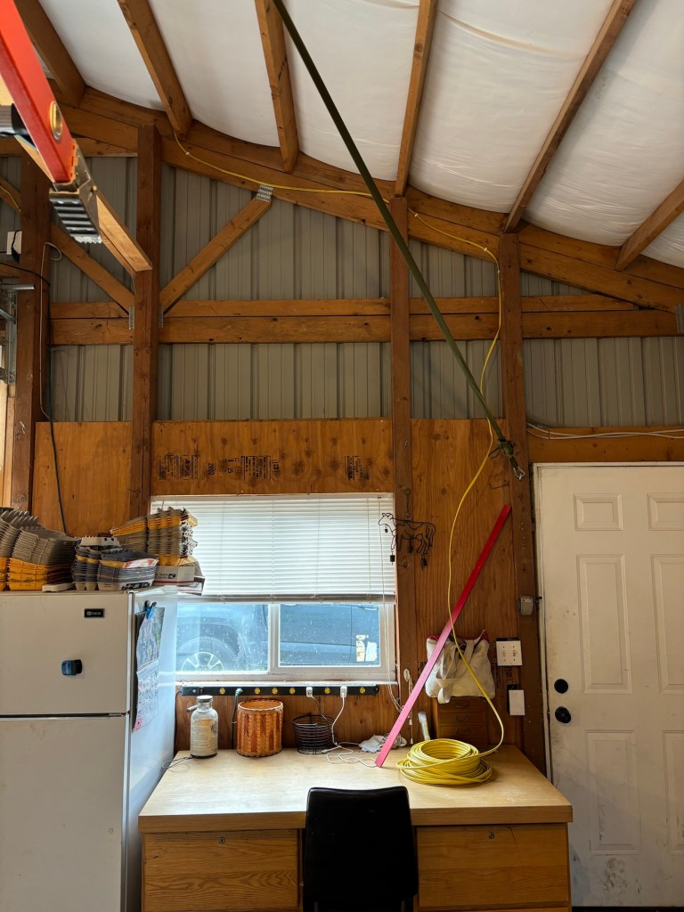 Wire is run, now we have to splice it into the existing electrical wiring, make an outlet on the outside wall on the opposite end of the shop, and voila!