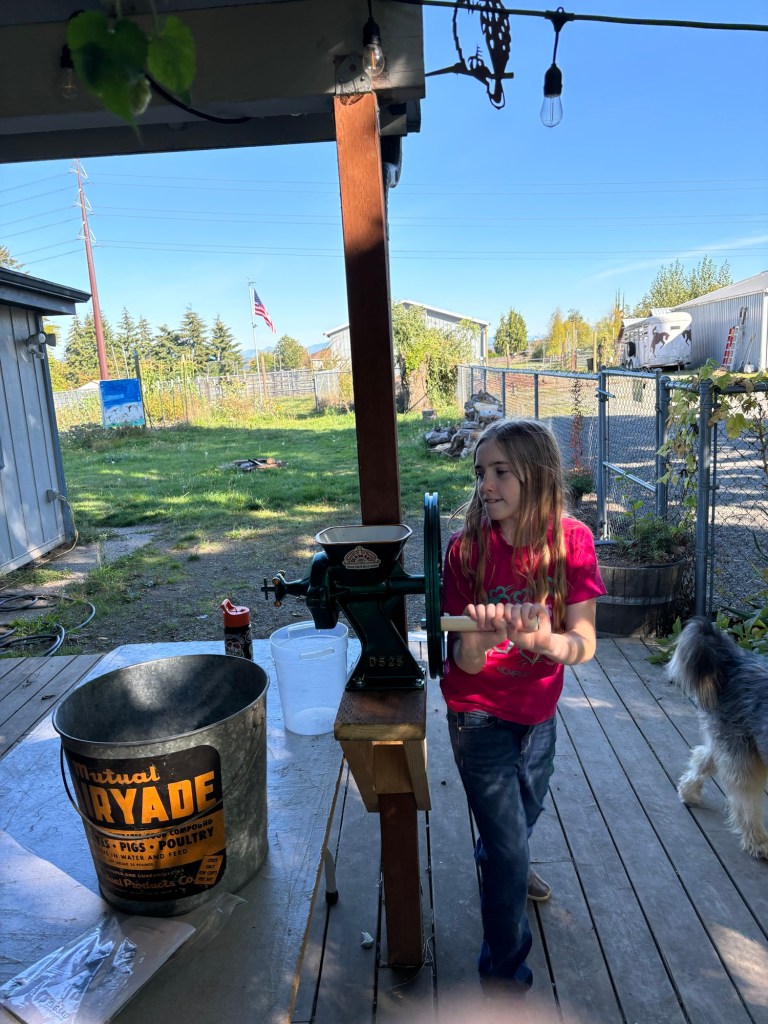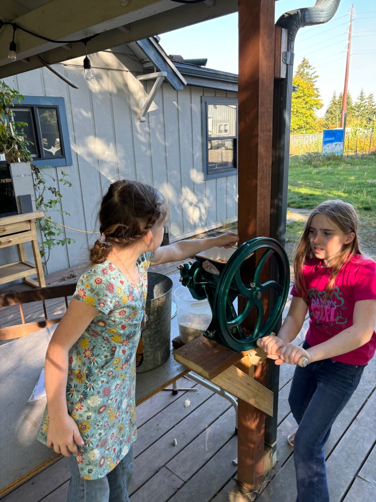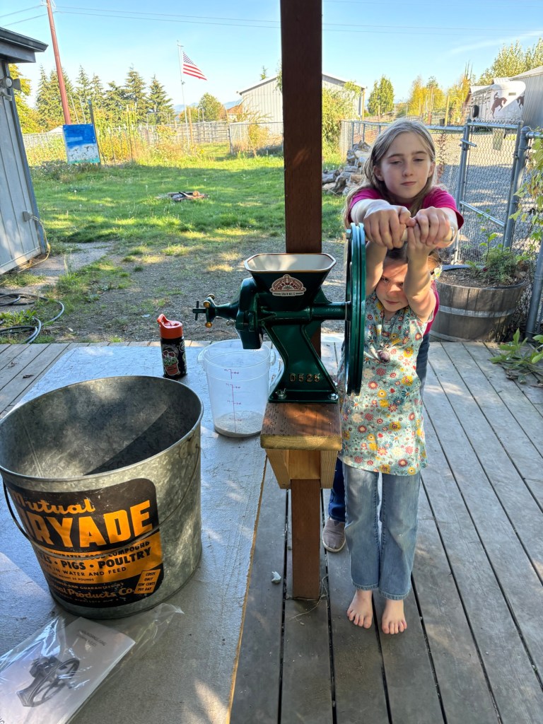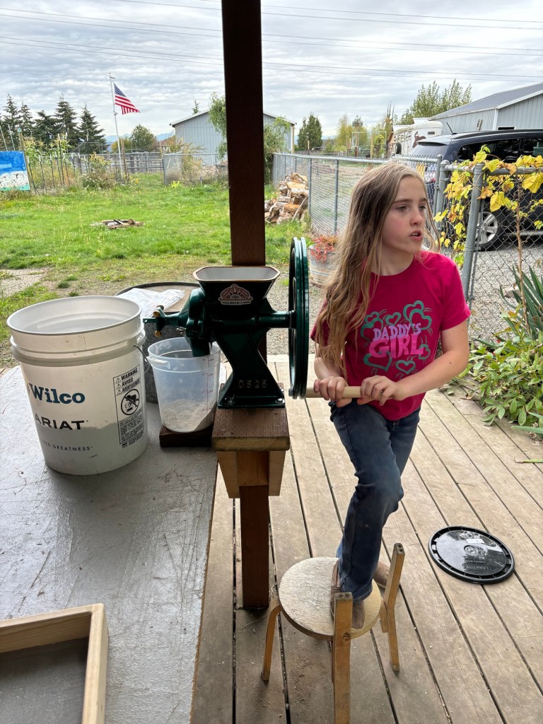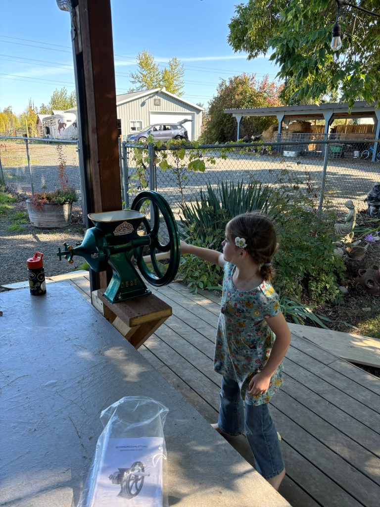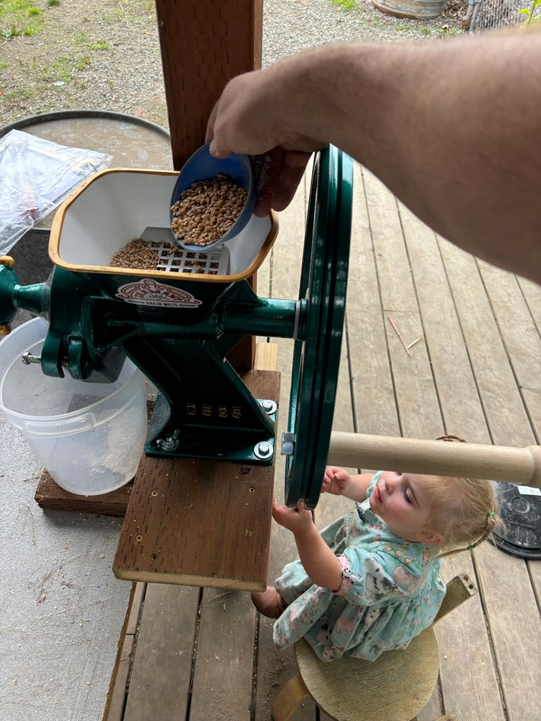 We got the grain mill set up on the porch at the farm. This is not an ideal location, since it has to be taken down between uses (a bit of a chore) so that it does not get wet. Ideally it would be indoors, but there is currently no room in the kitchen so this will have to do for now.