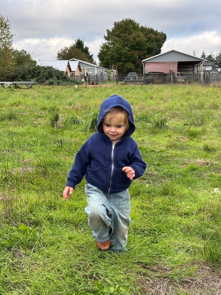 After the electrical work was done we sat down and had a breakfast of farm fresh sausage and eggs. Then Daddy went home and picked up Winnie. The older kids were with Deedee and Papa on an apple picking expedition, and Mommy had a headache, so Daddy and Winnie farmed together all day.