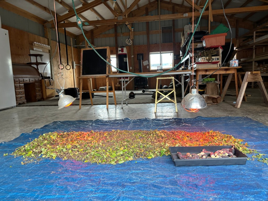 We also harvested the last of the buckwheat. Instead of cutting stalks and bringing them into the shop, we simply pulled the stalks in bunches and shucked the seeds off of them by hand into the trash can.