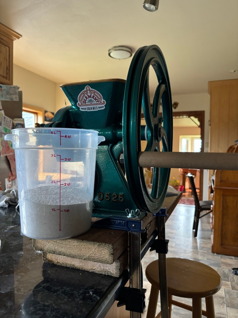 It took Daddy about 15 minutes to grind a little over 4 cups of berries into a little over a liter of flour.