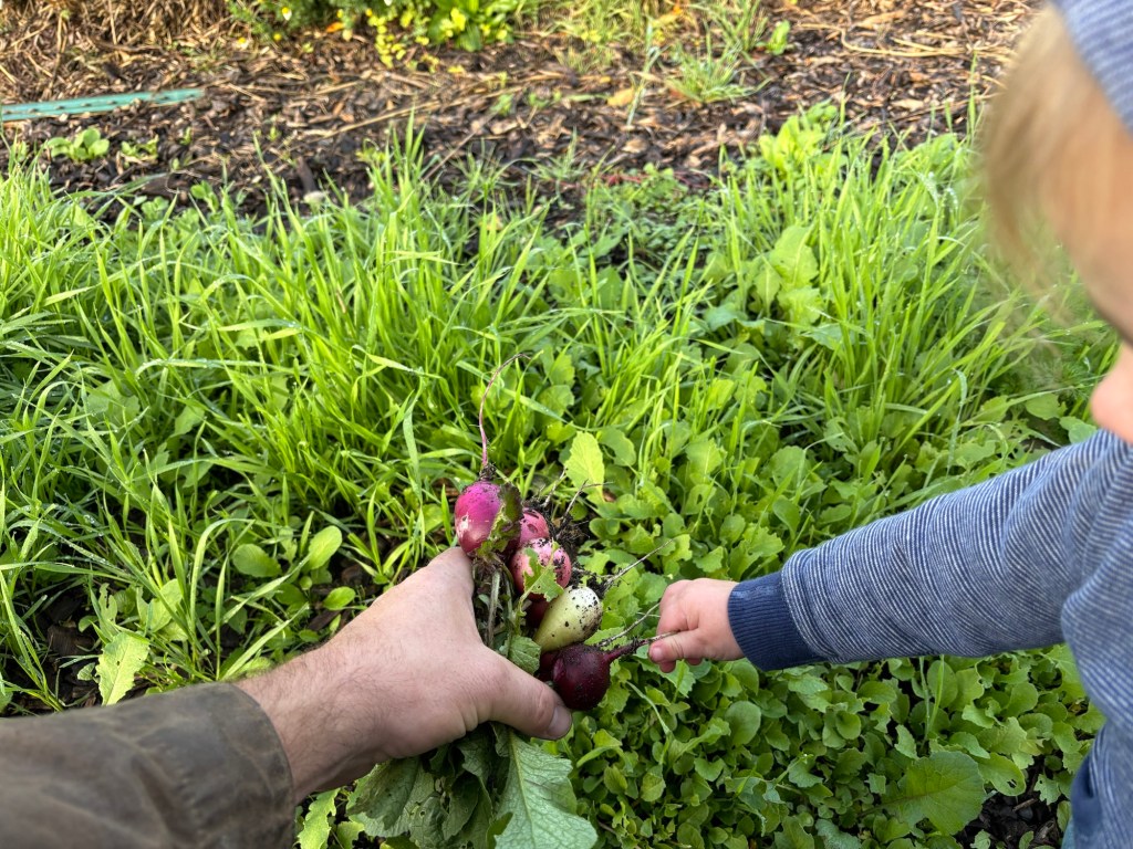 It is also growing radishes from the radish stalks that went to seed and dropped their seeds when we cleared the bed. No worries there, we can just pick and eat them as we go along. We may need to mow the wheat down once before spring if it gets too tall.