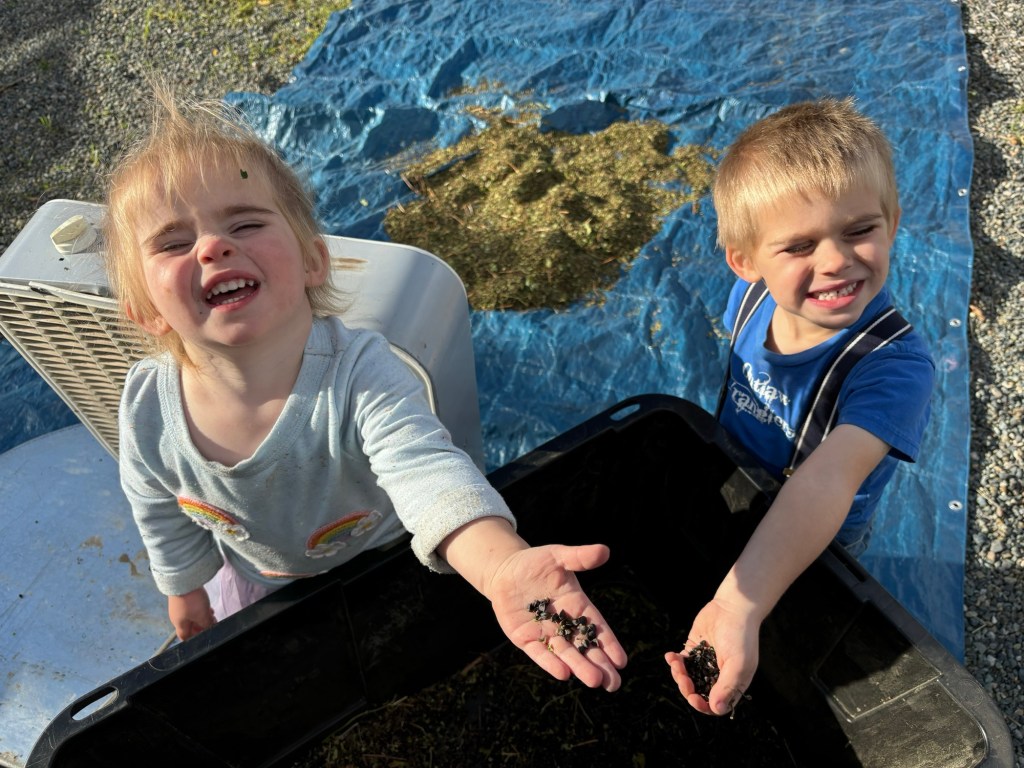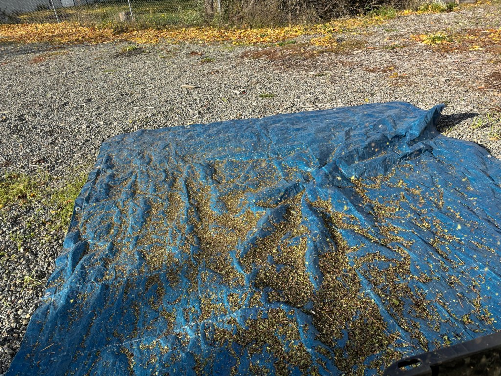 After initial screening we winnowed it with the fan. Winnowing it onto a tarp was a good call. It allows us to collect up the fannings and dump them in with the chickens, who can scratch through them to find any lurking buckwheat seeds.