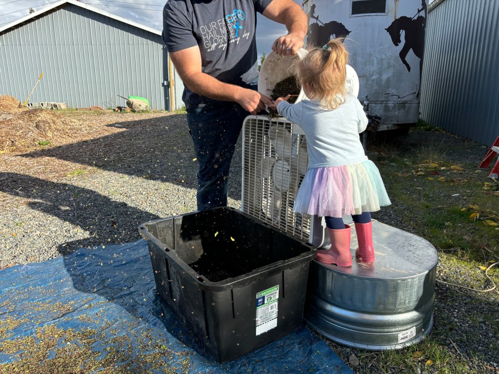 At this stage, a lot depends on small, gentle pushes. The best results happen when small amounts of material fall straight down in front of the fan with minimal forward movement. Then the seeds are more likely to stay in the tub, and the chaff is more likely to be picked up and blown away.