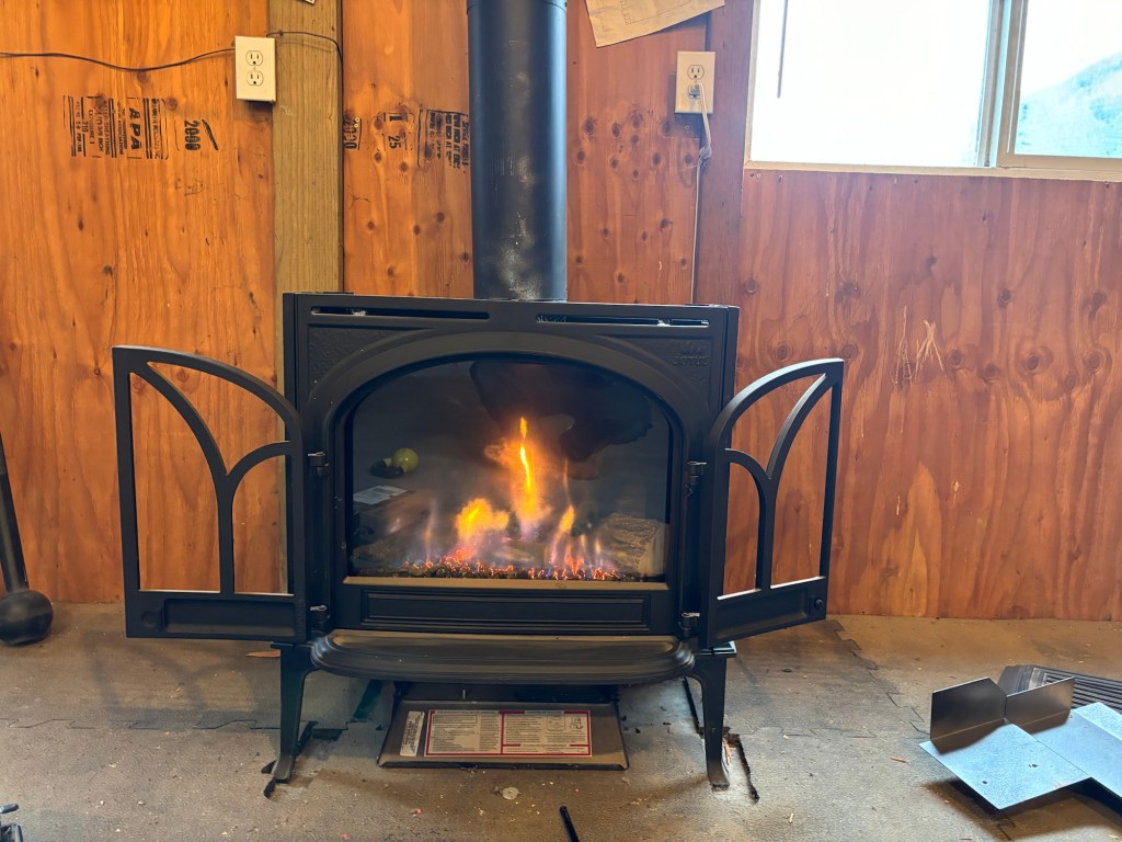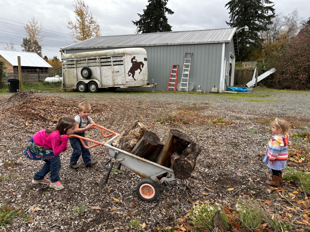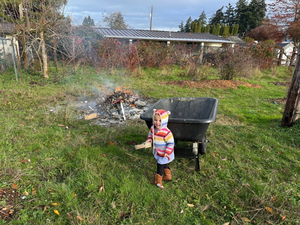 We continued the clean-up efforts by picking up some of the chunks of firewood that came with our chip-drop wood chips and putting them on the firewood pile.