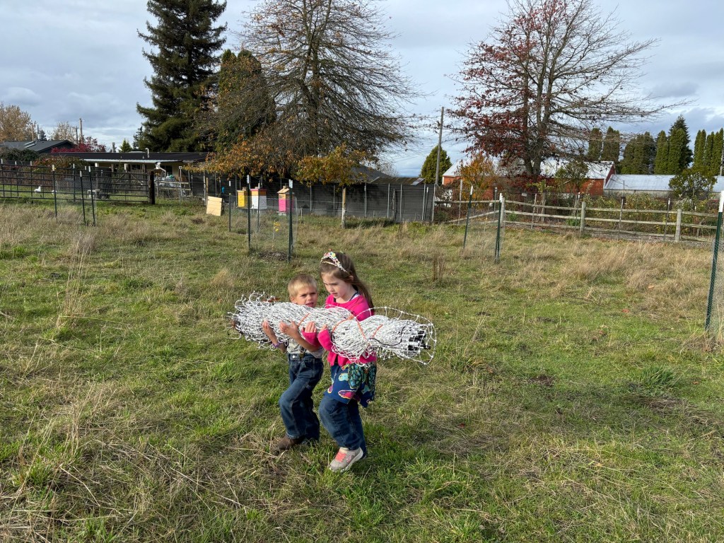 After Daddy rolled up the electric netting into bundles, they carried them to the barn to be stored away.
