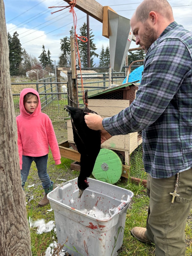 But finally, sticking with it even though her fingers were cold and stiff and tired and her tummy was grumbling for lunch, she finished her first duck. Since she had processed it herself we decided it would be hers to do what she wanted with. She asked if she could donate it to our parish priest, Father Lou, who was more than happy to receive a duck.