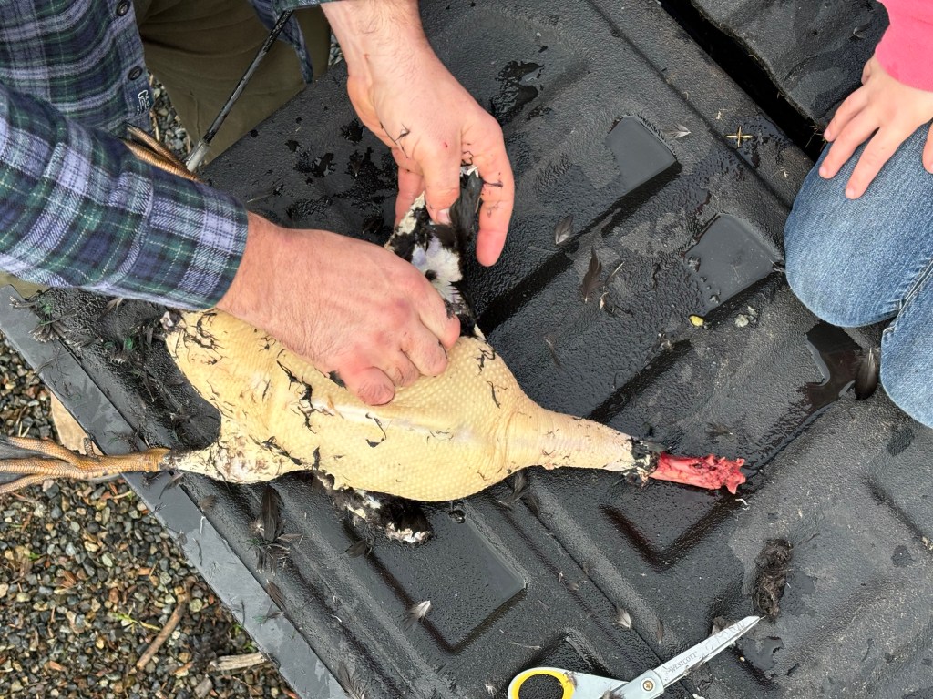 As you can tell from the posture of the carcass, she took long enough that rigor mortis had set in. This isn’t a problem from a food safety perspective, because the ambient temperature was 43 degrees (in fact it was getting colder and starting to rain at this point) but it does make the carcass more challenging to handle.