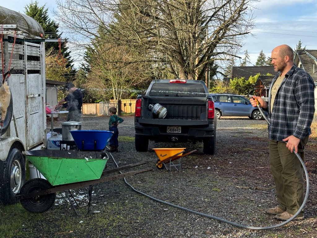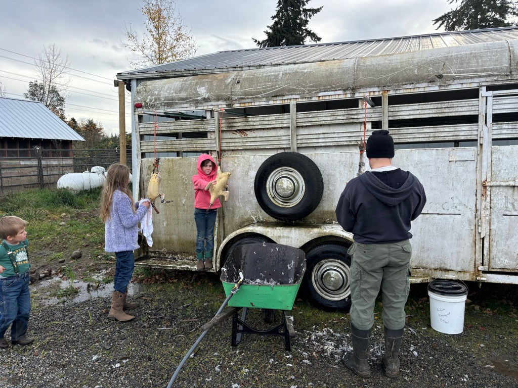 The post scalding pluck on the tailgate of the truck turned out not to be very helpful. What worked best was hanging them from the side of the trailer.