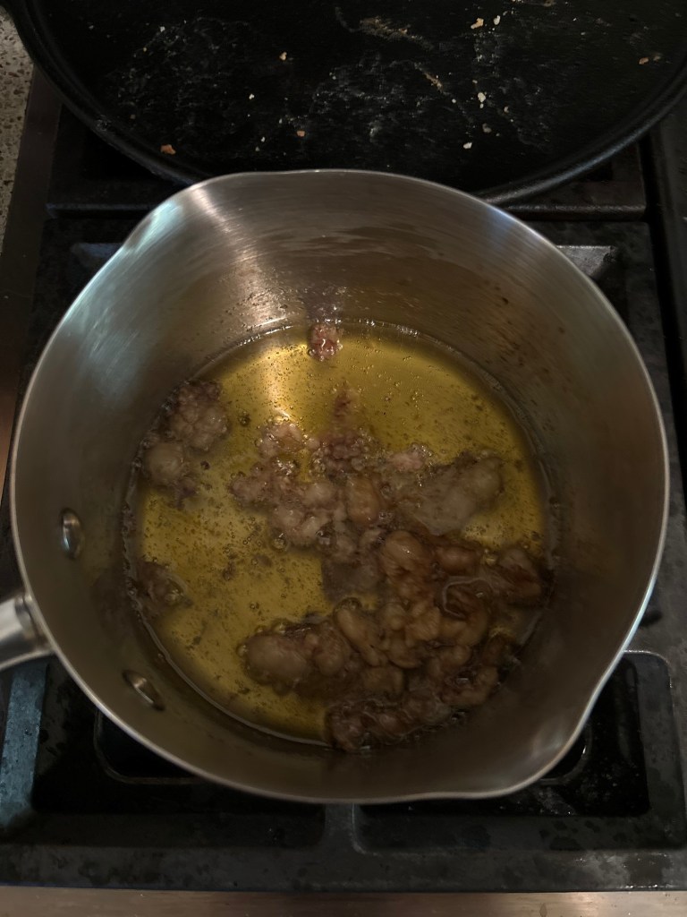 During the butchering process we pulled all the organ fat from the ducks and kept it, and today we rendered it down.