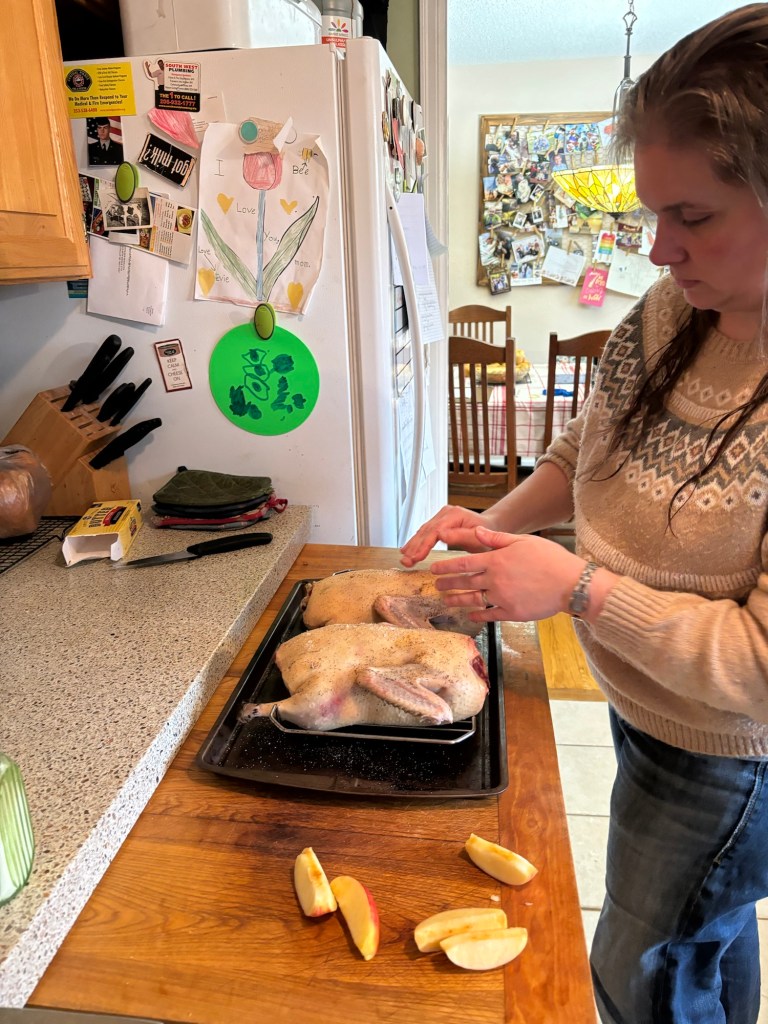 Kathleen stuffed them with apple and onion slices, and rubbed them with salt and pepper.