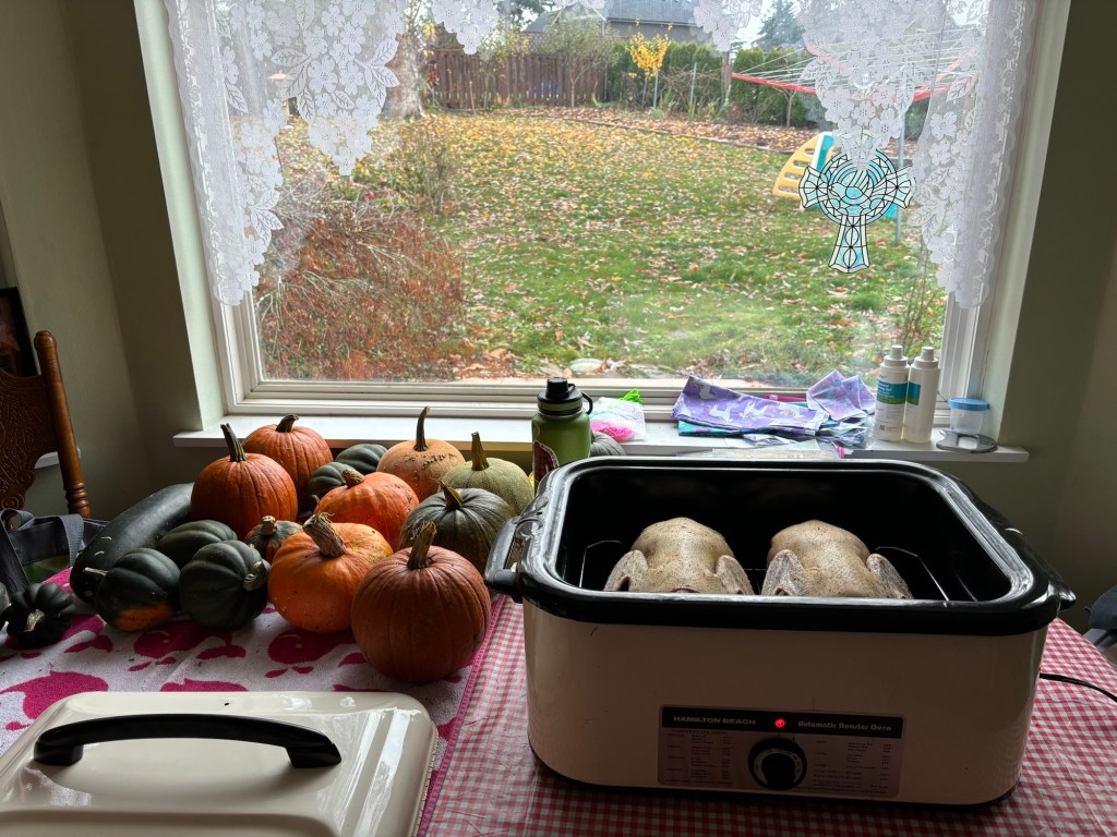 The roaster is great because it spares up oven space for pies and custards. After about 45 minutes in the roaster she moved them into the now-empty oven to crisp the skin for another 15 minutes, until internal temperature in the breast was 150 degrees.