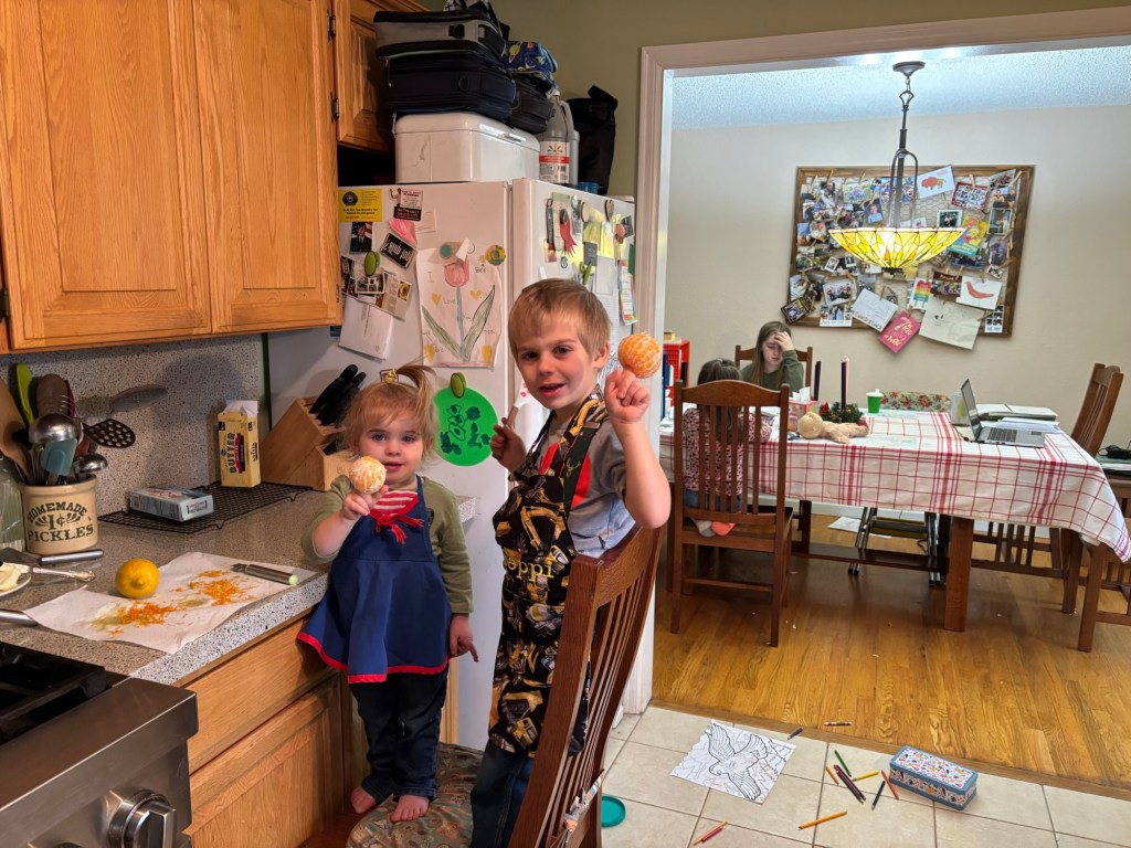 First we zest two small oranges and a regular sized lemon. Then we stick an orange each on the finger of the small helpers. Apparently, according to them, this is an essential part of the process. No one knows why or what would happen if we didn’t do it. Best not to find out.