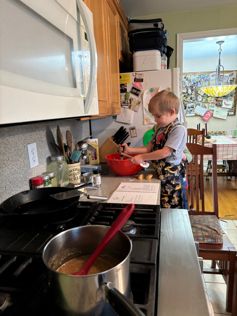 Of course there is always the likelihood that he will whisk half the mixture out of the bowl and all over the counter. We believe this is a whisk worth taking. Try not to supervise the minions so close that the honey/milk/sugar mixture boils. I’m not sure we are quite ready live in a land flowing with milk and honey.