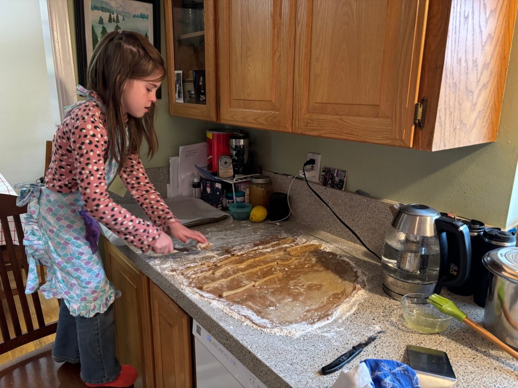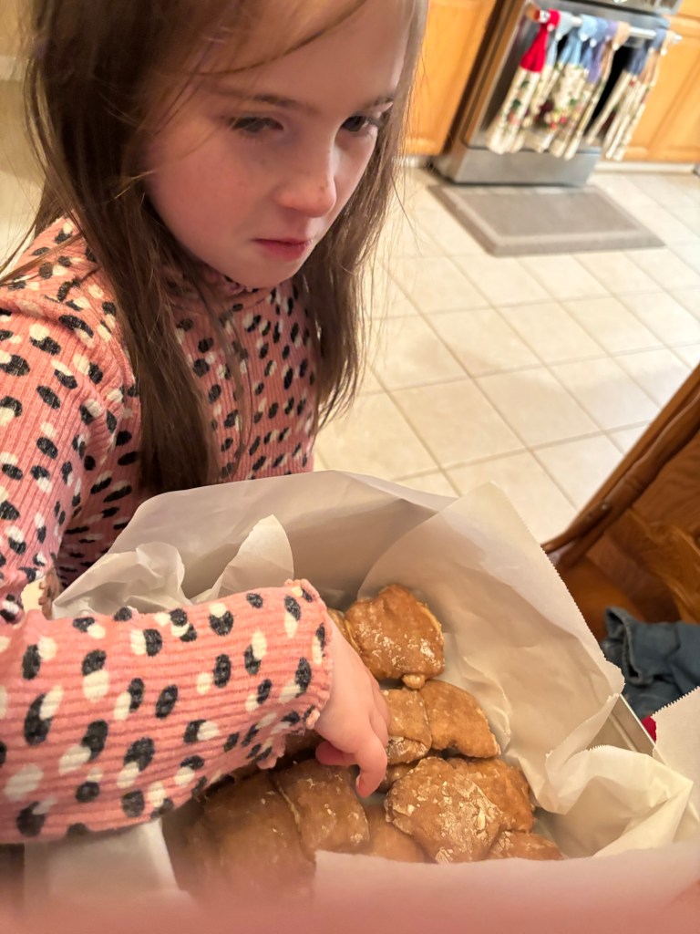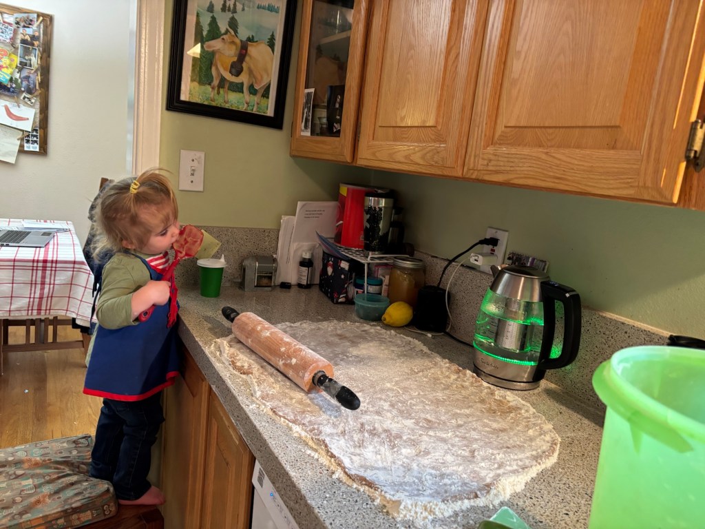 Or you can bake Christmas cookies like we usually do, a batch here, a batch there, in between violin recitals, homeschooling, defusing quarrels, wiping noses and butts, driving over to the farm to do chores, and trying not to trip on the pile of colored pencils and pretty pictures on the kitchen floor.