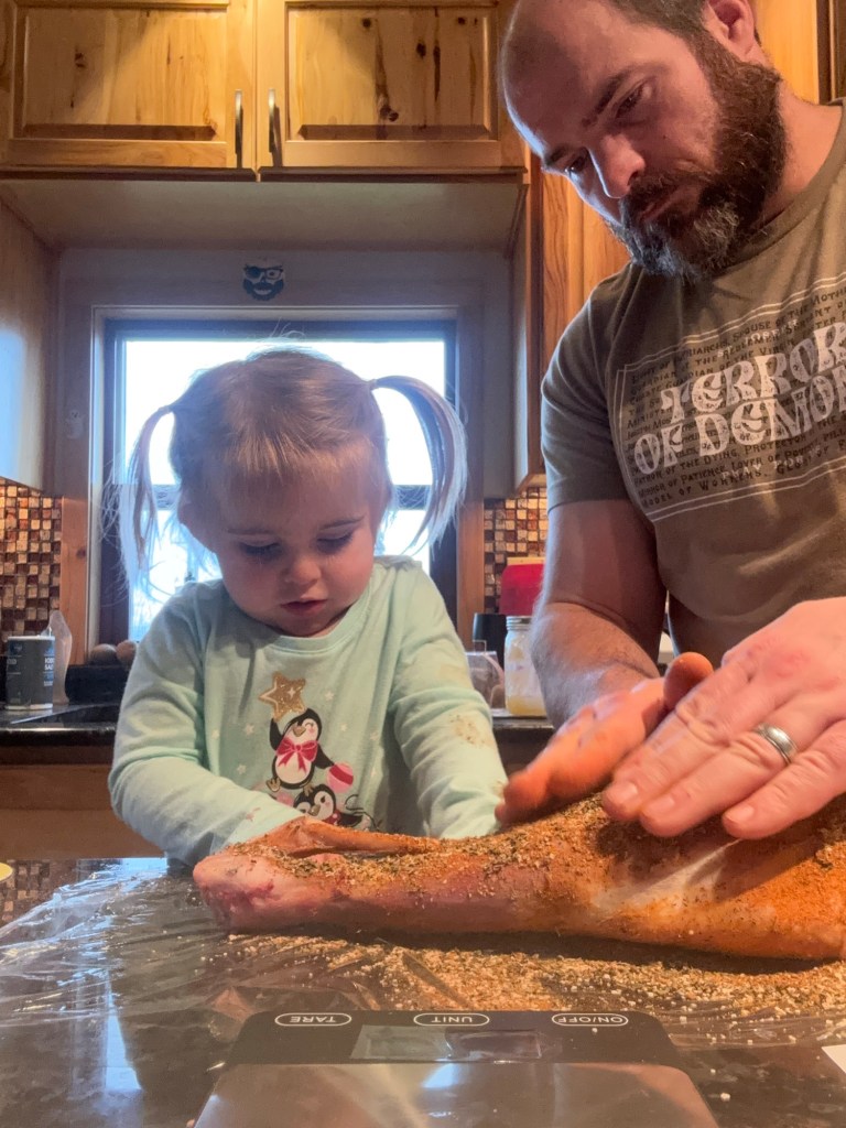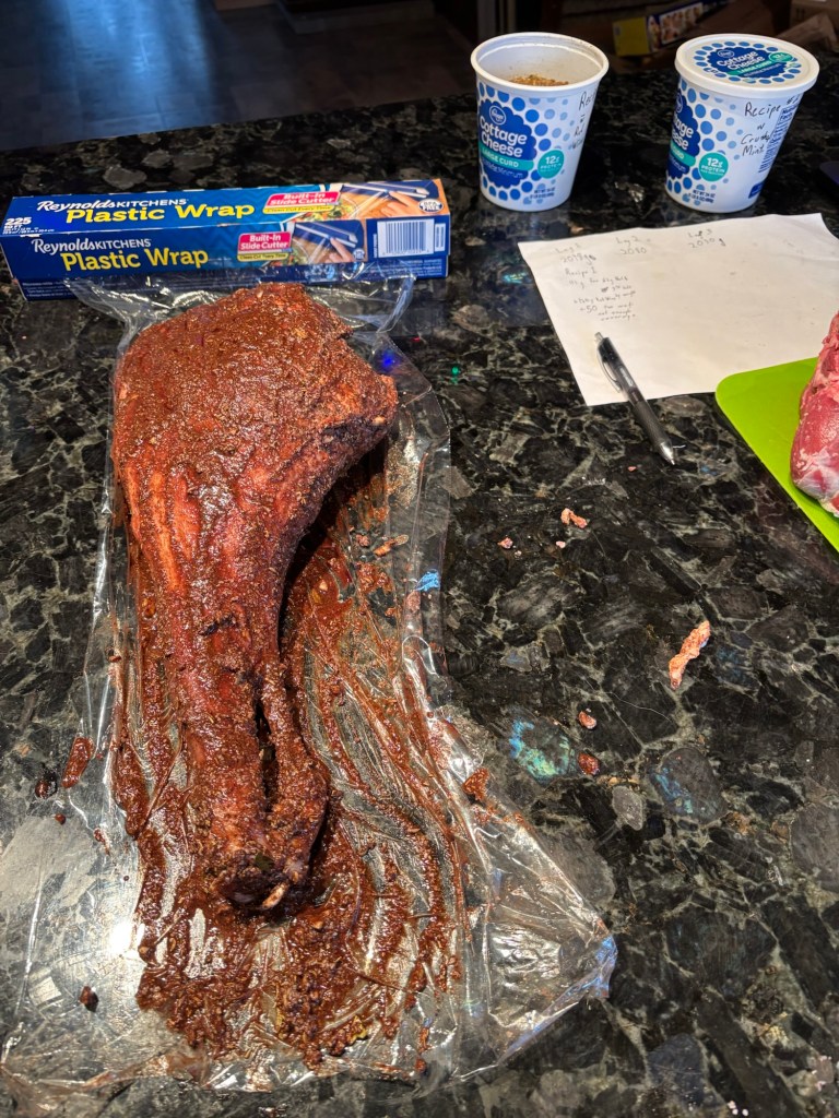 Leg #2 2080g. This recipe called for 5% total salt between two rubs, so I measured out 105g of mix for 52g of salt.