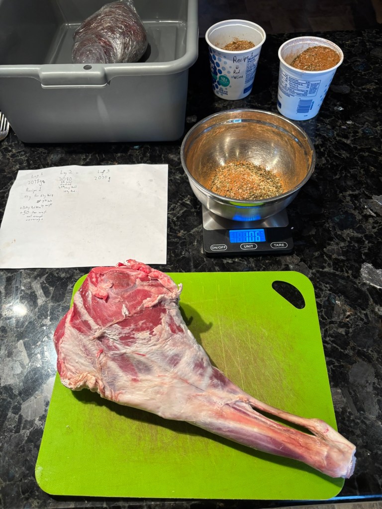 Leg 3: 2030g. 3% mass = 61g of salt. This time we are dividing the 3% between two rubs to see if: 1) the meat will spoil; 2) leg 3 will be noticeably less salty than leg 1.