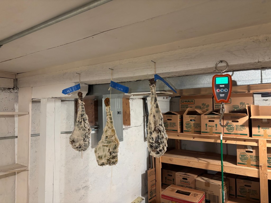Of course, the long term solution, if we want to keep aging meats, is to build a drying chamber in the basement closed off from the rest of the basement, with its own little humidifier in there. Alternatively we could simply put an old refrigerator down there, with a bowl of salt water and a circulating fan in it. For now, we are going to see how this does.
