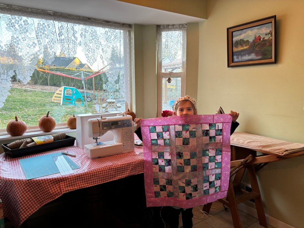 After Mass, and Religion class, and Daddy getting home from work (Clinic weekend) we cut the binding and sewed that on.
