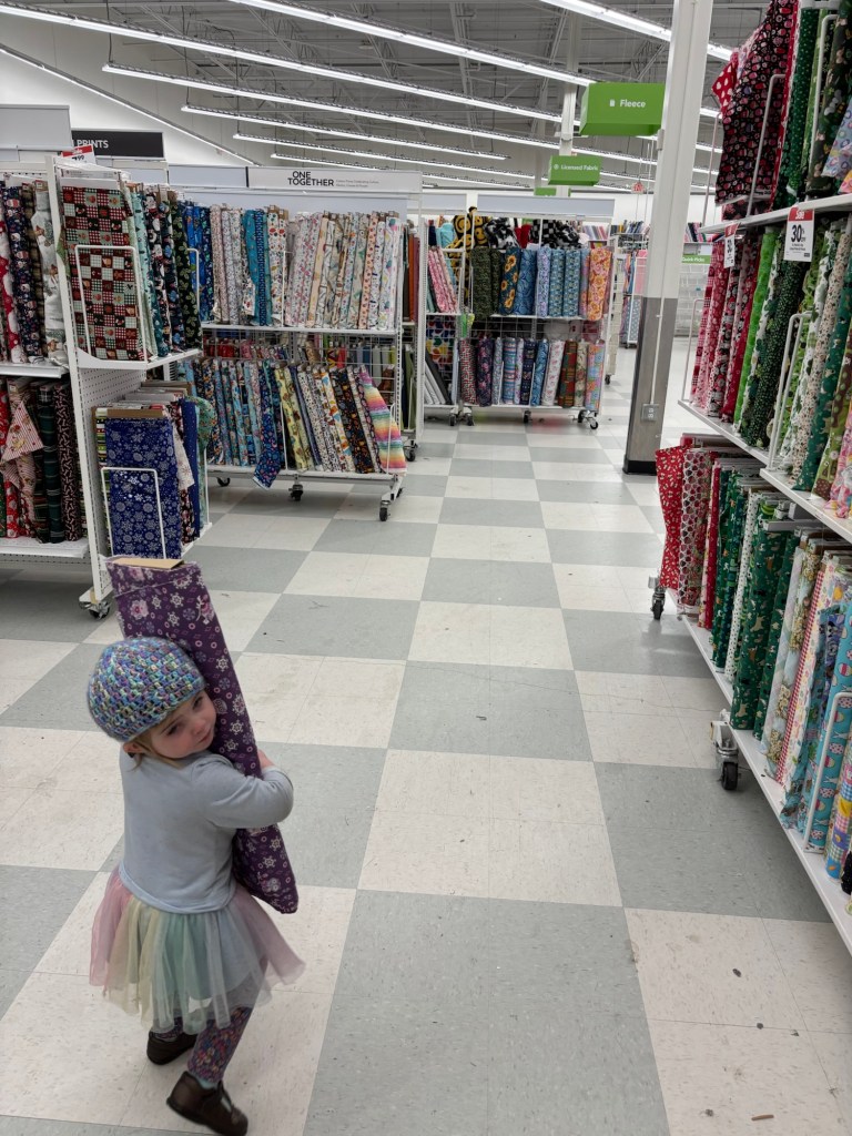 Winnie and Daddy took a quick trip to the post-apocalyptic wasteland formerly known as Jo-Ann Fabrics and Winnie picked out a pretty clearance fabric to use as the back.