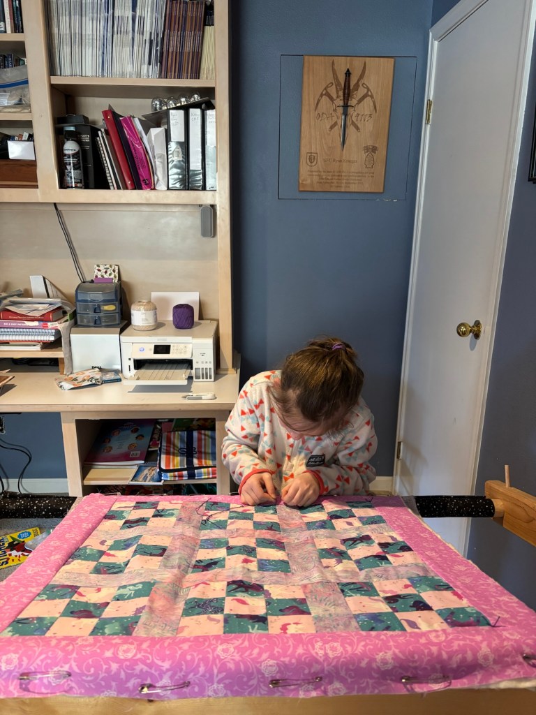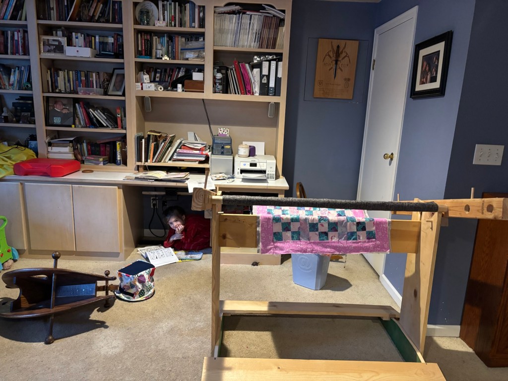 This morning when Mommy woke up, Ellie was under the desk reading Calvin and Hobbes, with a fully tied quilt on the frame.