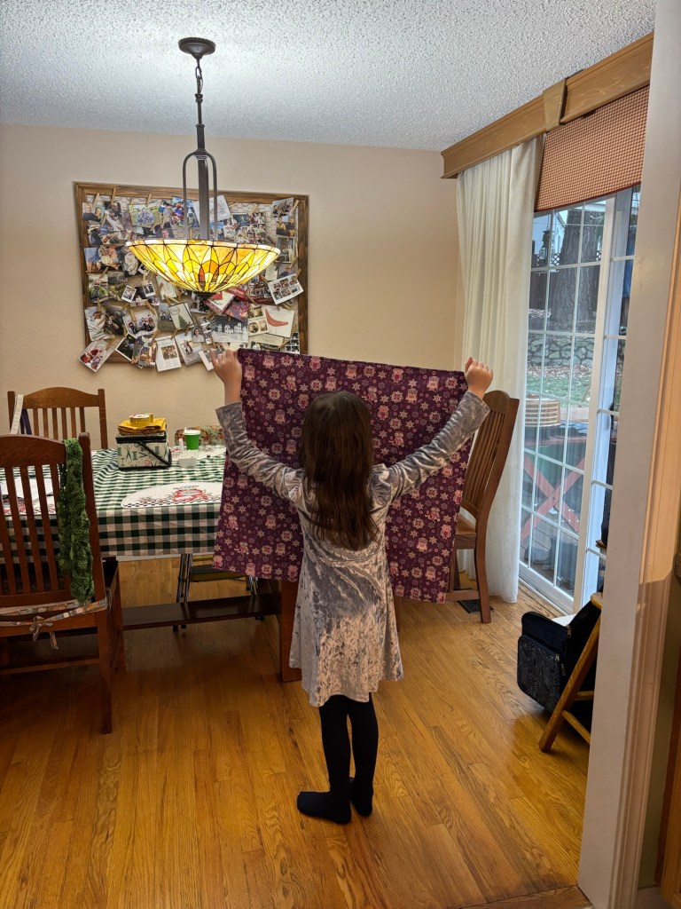 It is the sort of project that is hard to keep after consistently because we do not have a dedicated sewing area. In order to use the sewing machine we have to clear off one of the tables, which is easier said than done. Ellie kept after it though, and last week she finally finished the top.